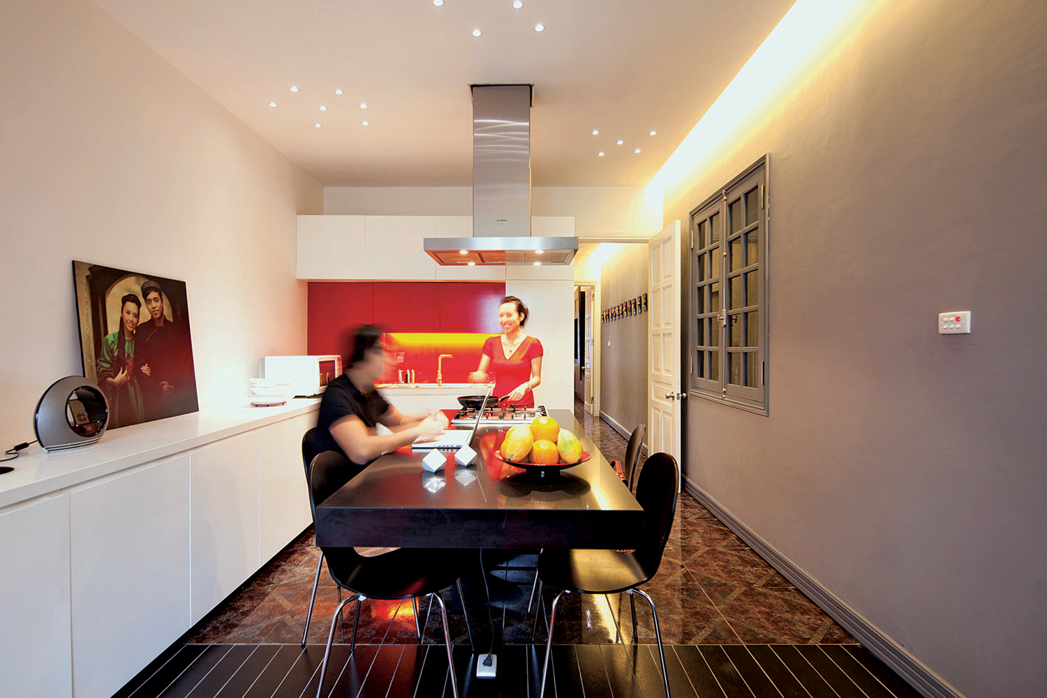 Cũng như nhiều ngôi nhà ống khác, không gian ở đây có chiều dài lớn hơn nhiều lần chiều rộng. Công trình được thiết kế theo nguyên lý “Đồ nội thất kiến tạo không gian”. Có nghĩa là các đồ sử dụng được thiết kế không chỉ mang ý nghĩa về mặt sử dụng, mà chúng còn kiến tạo không gian.