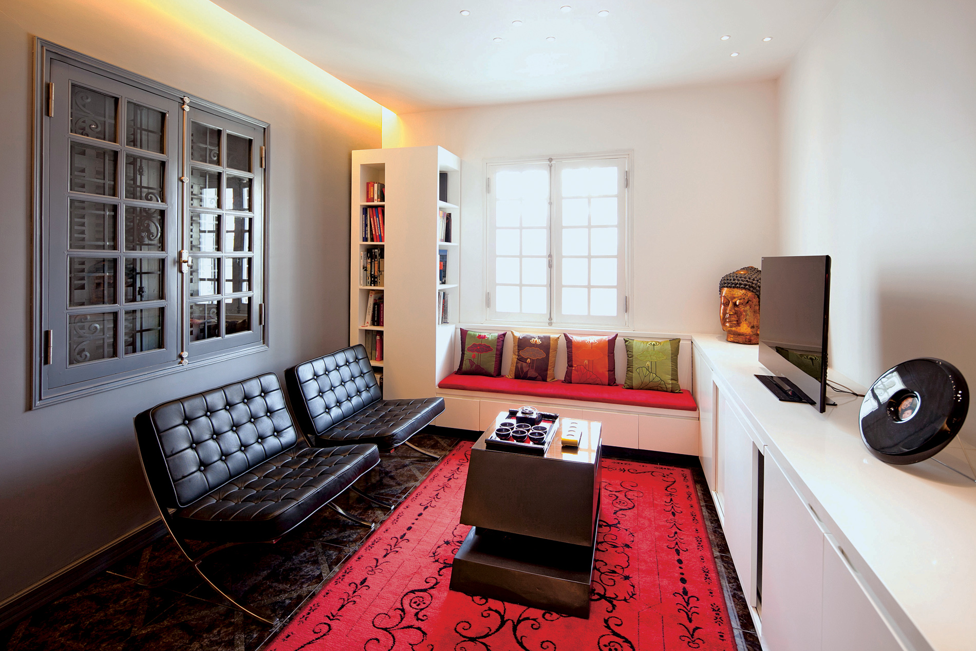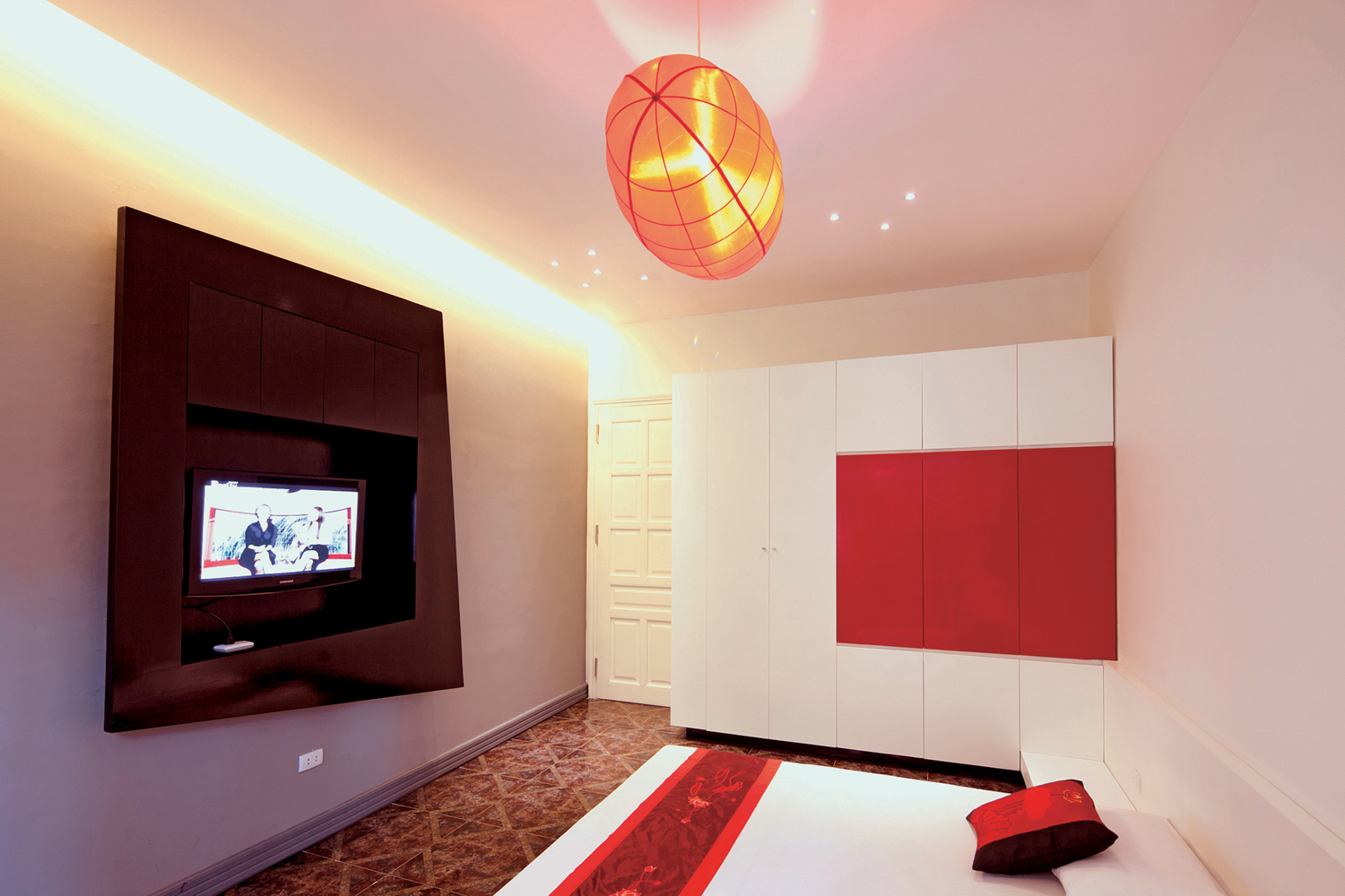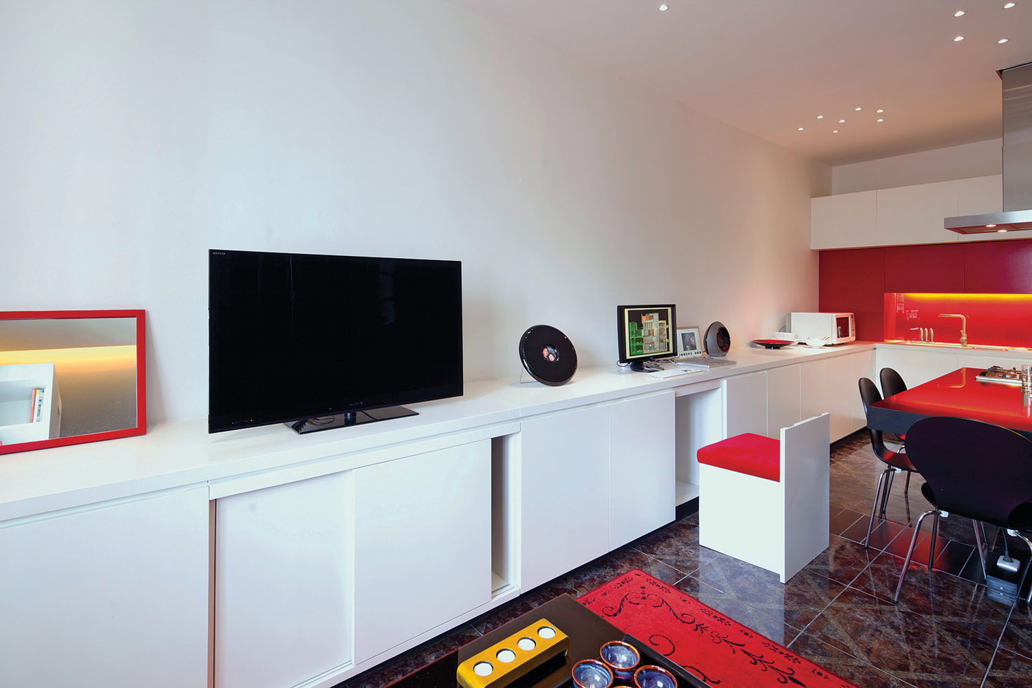 Khối to sát tường mầu trắng cùng mầu tường, do vậy tránh đi cảm giác xâm chiếm không gian. Một số các điểm nhấn đỏ được đặt một cách khéo léo vào khối tủ này để tăng thêm cá tính và tạo ra sự ấm cúng trong nhà.