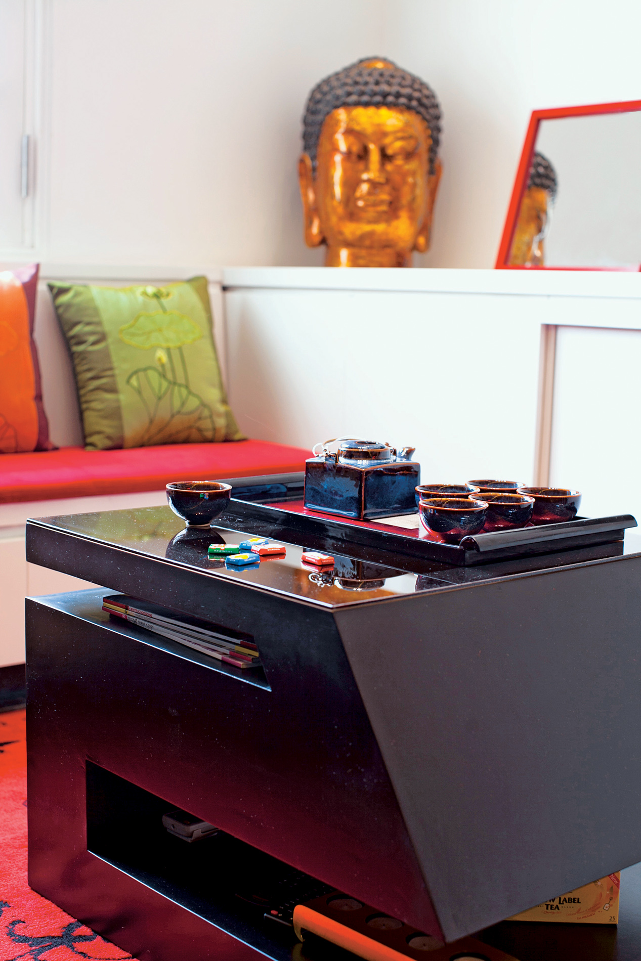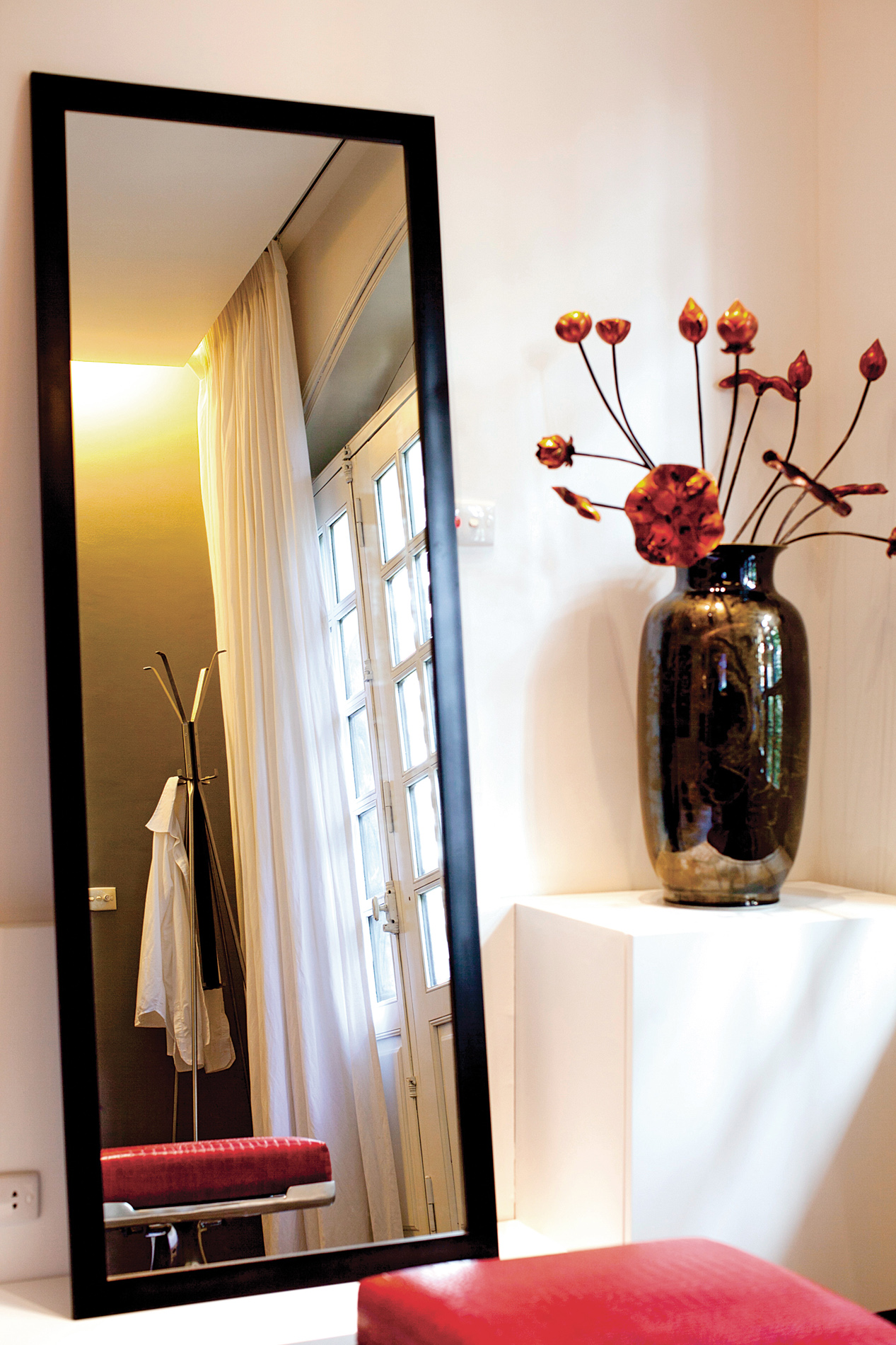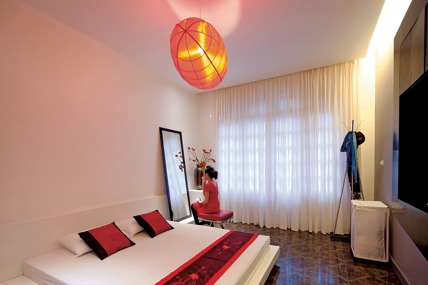Khối to sát tường mầu trắng cùng mầu tường, do vậy tránh đi cảm giác xâm chiếm không gian. Một số các điểm nhấn đỏ được đặt một cách khéo léo vào khối tủ này để tăng thêm cá tính và tạo ra sự ấm cúng trong nhà.