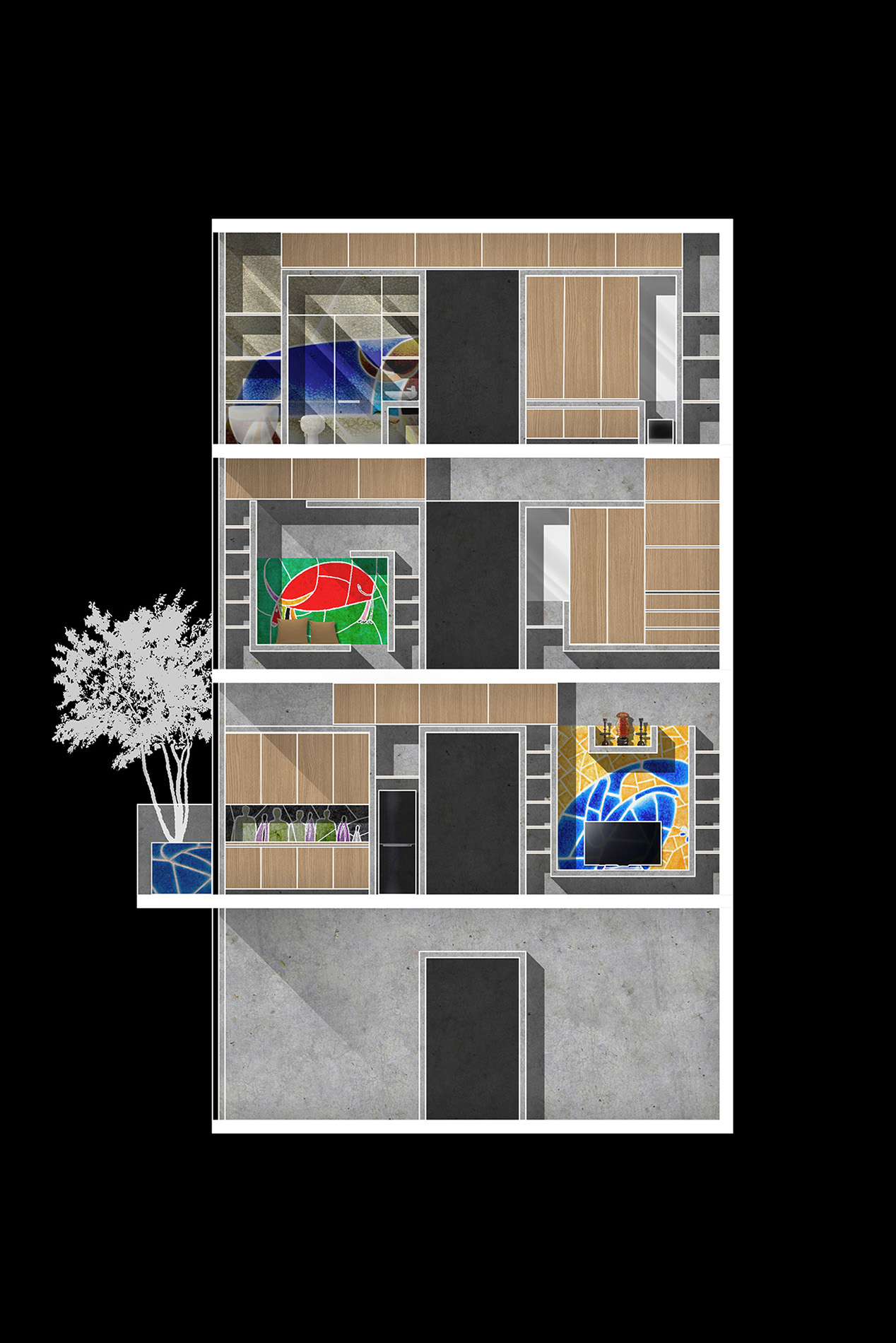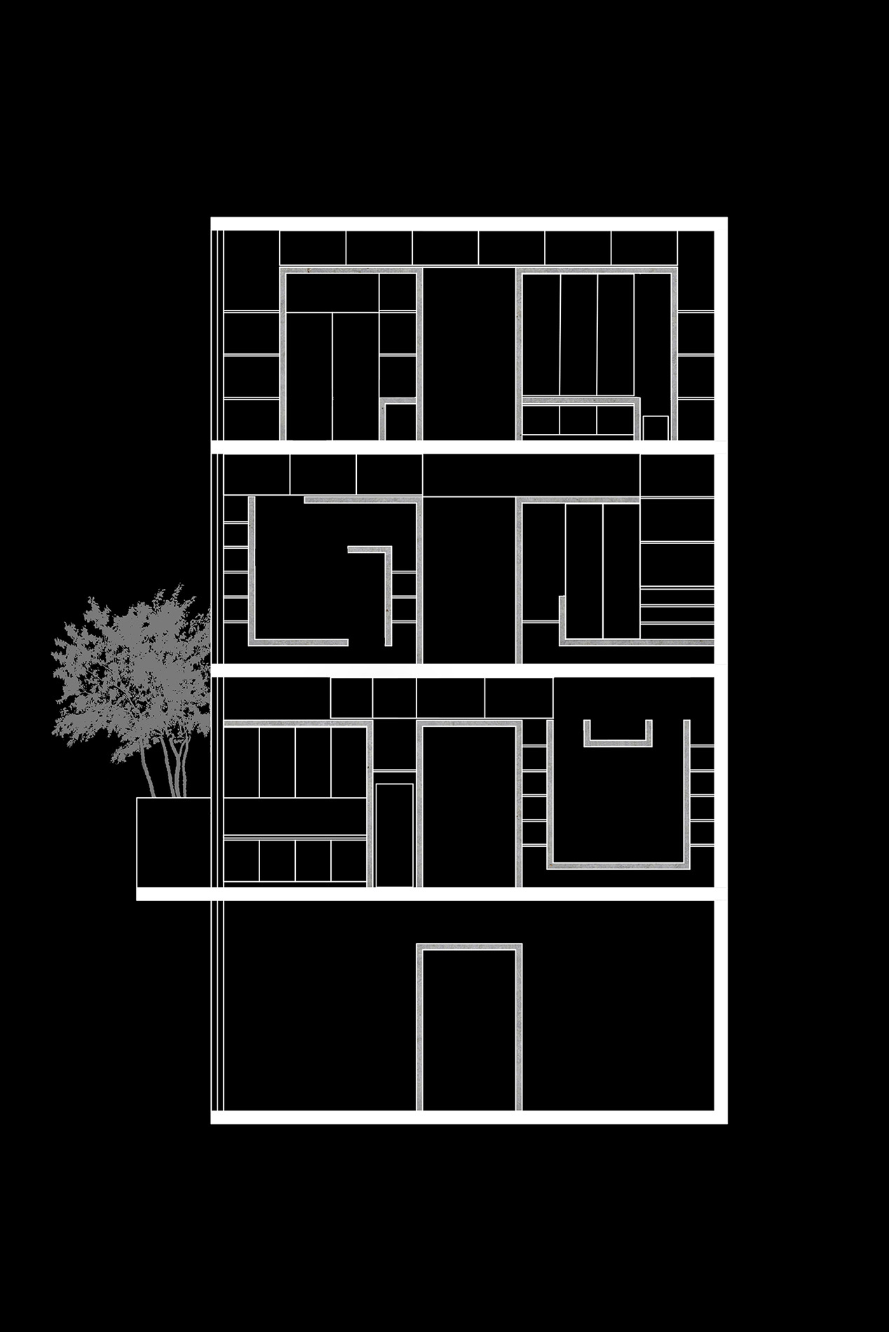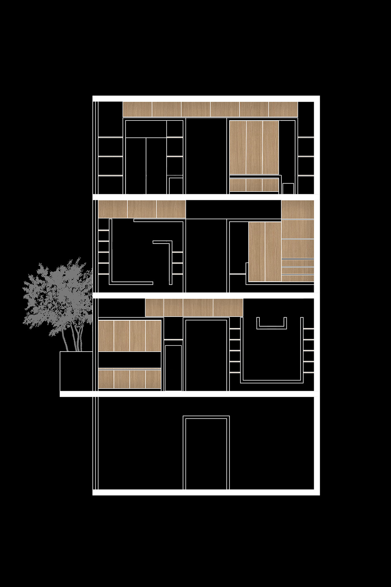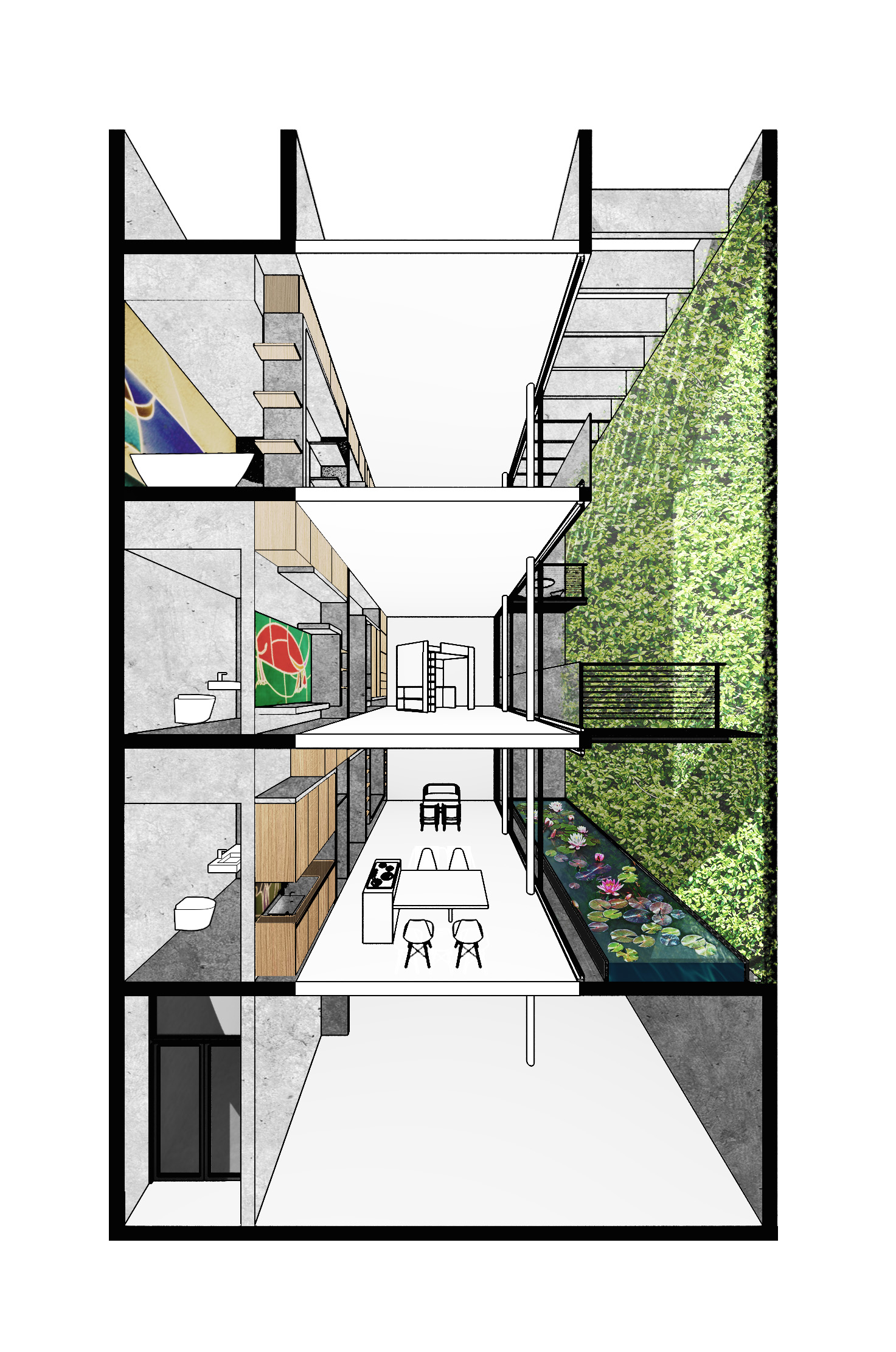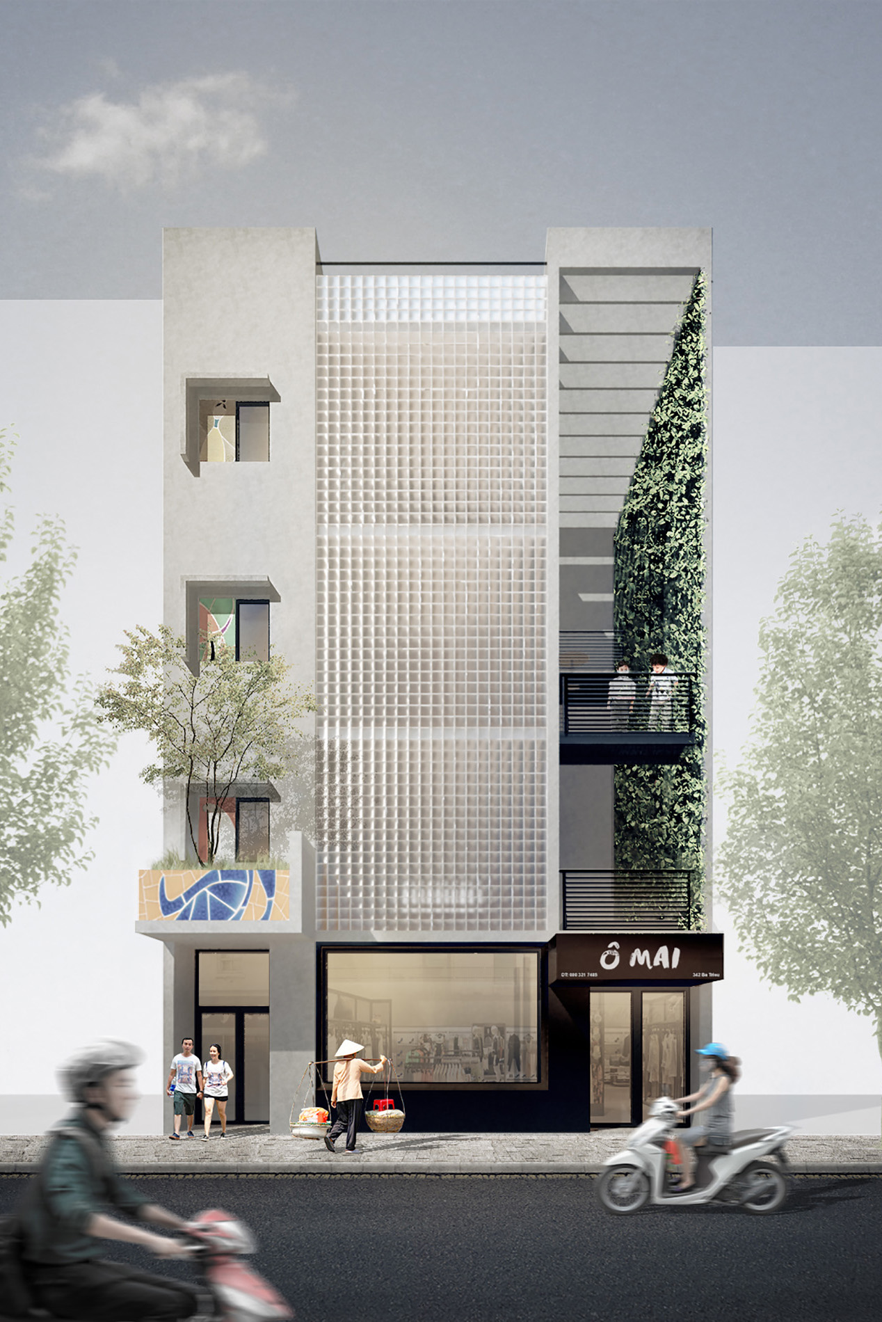 BM house là dự án mà chúng tôi nghiên cứu mô hình nhà ở liền kề trong các đô thị Việt Nam, có sự kết hợp không gian thương mại ở tầng 1 và không gian ở phía trên. Một trong những hạn chế lớn trong những ngôi nhà ở liền kề là bị mất mối liên hệ giữa con người với thiên nhiên. Nguyên nhân của việc này thường là do ngôi nhà có ít diện tích tiếp xúc với thiên nhiên, cùng với việc tổ chức các không gian phục vụ chưa hiệu quả. Để giải quyết hạn chế nói trên, ở dự án này, chúng tôi muốn tạo ra các không gian một cách tối ưu nhất. Tầng 1 mở rộng để linh hoạt tối đa cho kinh doanh. Các tầng trên, mặt bằng được chia làm 3 phần rõ rệt. Không gian sinh hoạt ở giữa, hai không gian phụ trợ ở hai bên. Không gian phụ trợ thứ nhất được coi như một « hệ đồ vật » bao gồm thang, toilette, chậu cây, tủ bếp, tủ quần áo, tủ tivi, giá sách… Hệ đồ vật này là nơi trình diễn của những vật liệu đã được bàn tay con người chế tác như gạch, gỗ tự nhiên và những mảng tranh gốm. Cấu tạo của các đồ vật trong nhà nằm trong chuỗi nghiên cứu « Đồ nội thất kiến tạo không gian » mà chúng tôi đã thực hiện ở nhiều công trình trước đây. Không gian phụ trợ thứ hai được coi như một « khối thiên nhiên ». Khối này là ánh sáng, gió, nước và cây xanh. Những yếu tố này luôn biến đổi trong từng khoảnh khắc. Chúng tạo ra chiều thời gian cho không gian sống. Như vậy, cấu trúc không gian trong căn hộ gồm 3 phần: kỹ thuật, con người, thiên nhiên. Mặt tiền ngôi nhà cũng được thiết kế một cách rõ ràng như mặt bằng. Nói đúng hơn là các công năng trong nhà như thế nào sẽ được thể hiện ra ngoài mặt tiền như vậy. Ngoài tầng 1 mở rộng cho kinh doanh, để tránh đi sự ồn ào của đô thị, mặt tiền của ngôi nhà gần như đóng kín. Tuy nhiên khối thiên nhiên vẫn được mở ra phía ngoài để đóng góp mảng xanh cho đô thị, cũng như không làm mất đi hoàn toàn mối liên hệ của những con người sống trong ngôi nhà với phố phường.