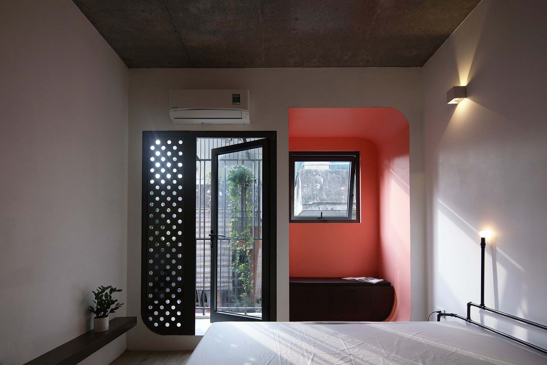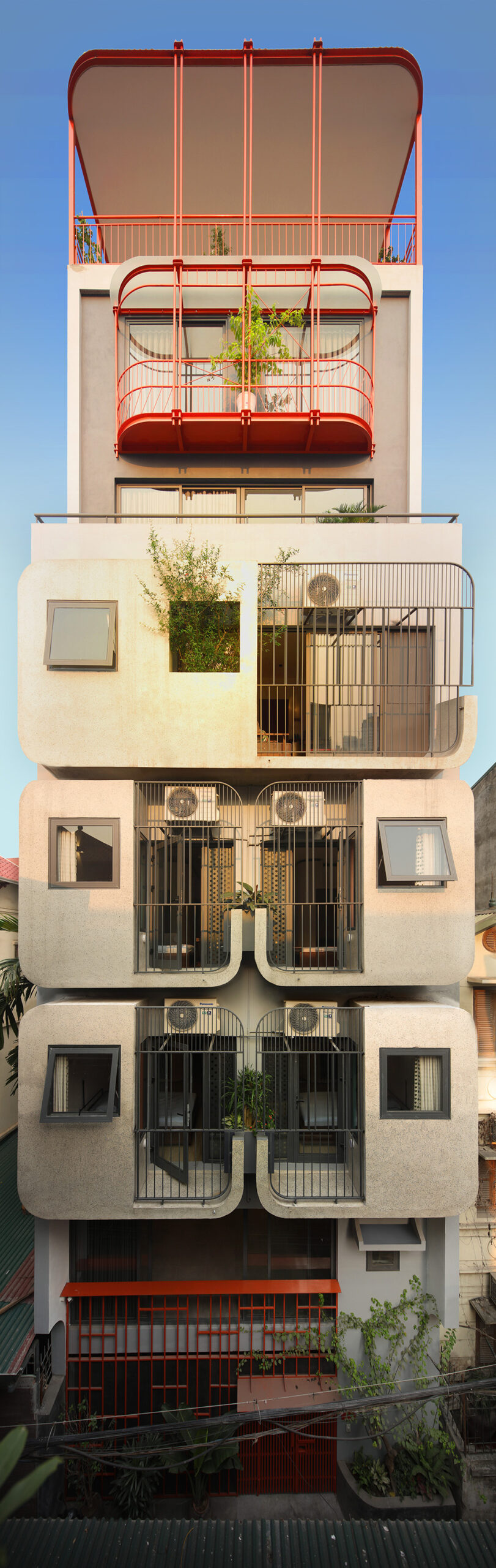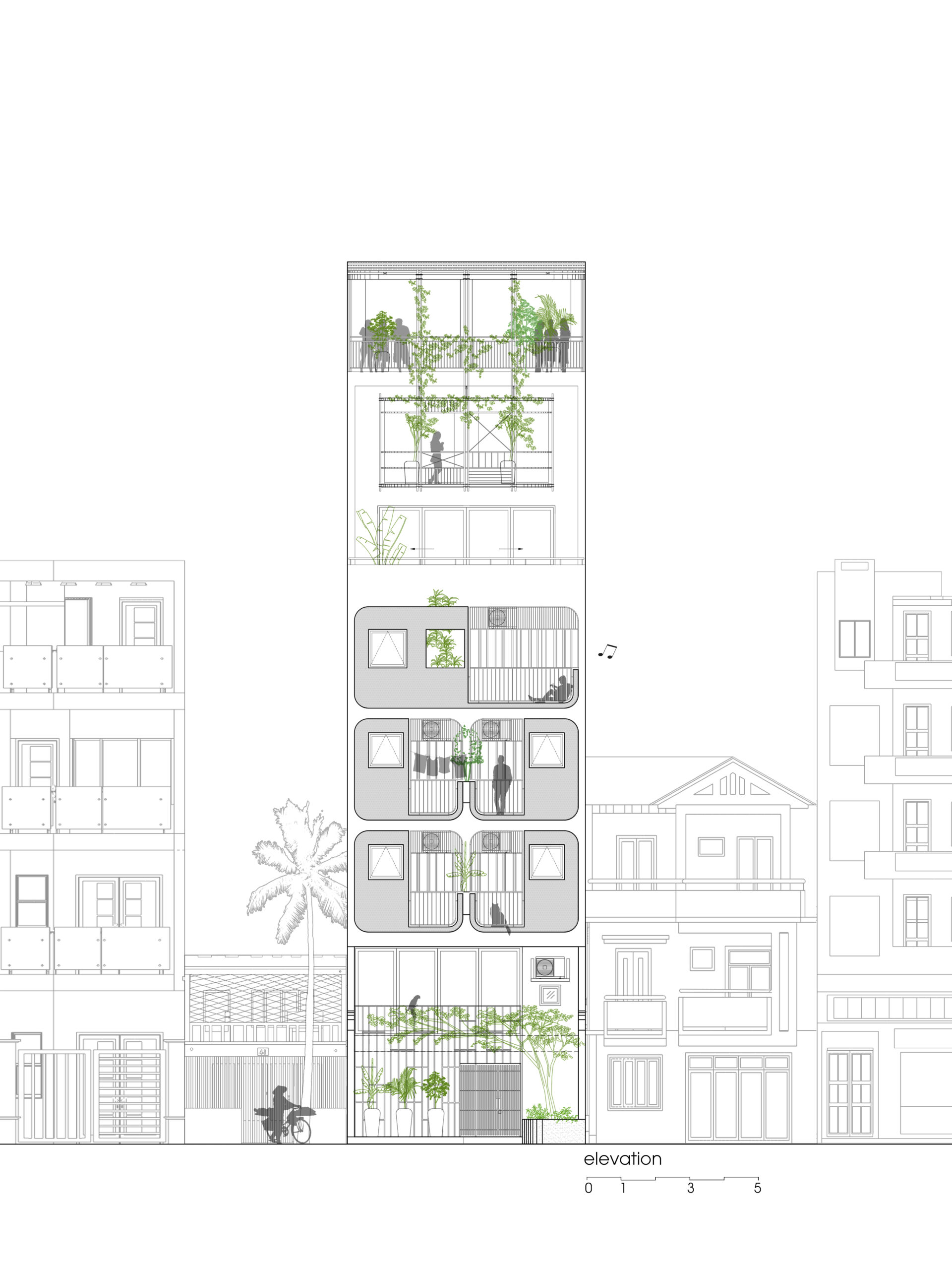 Không gian sinh hoạt chung tầng một với chiều cao 6,5m, kết nối với khoảng vườn sân trong và liên thông với tầng lửng. Tầng lửng là một không gian linh hoạt đa năng – nơi người trong toà nhà có thể tổ chức triển lãm, mở các lớp học kỹ năng hay những buổi nói chuyện chuyên đề… Phần phía trên, từ tầng 2 đến tầng 7 là các không gian căn hộ khép kín. Mỗi căn hộ dù lớn hay nhỏ đều được thiết kế đầy đủ tiện nghi, tràn ngập ánh sáng và thông thoáng tự nhiên, gồm cả những không gian cơ bản và thêm khoảng ban công đặc biệt. Phần ban công này được chúng tôi tổ hợp giữa không gian trong và ngoài nhà, nơi vừa là không gian nghỉ ngơi thư giãn, cũng là không gian đọc sách, không gian cây xanh…
