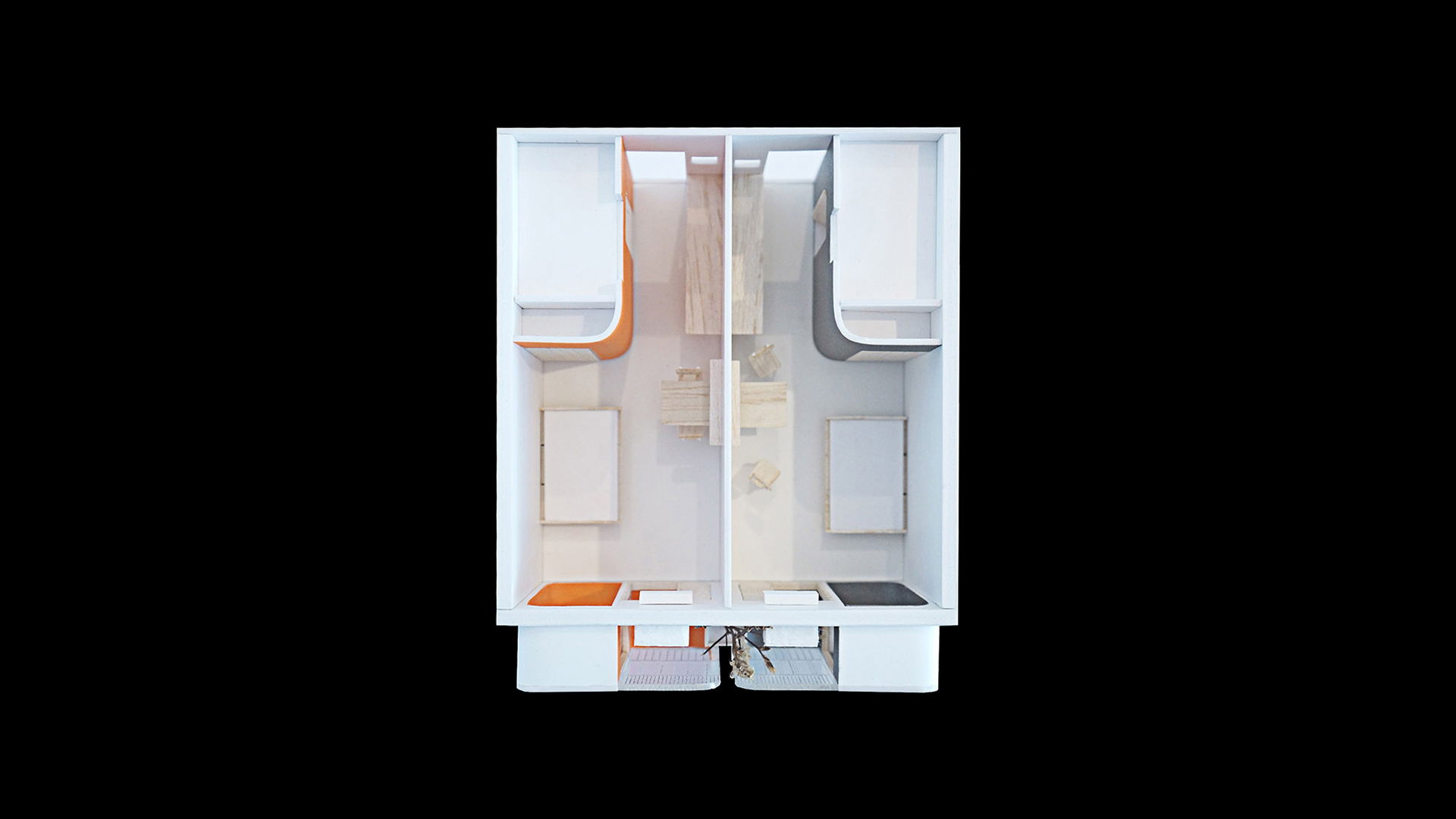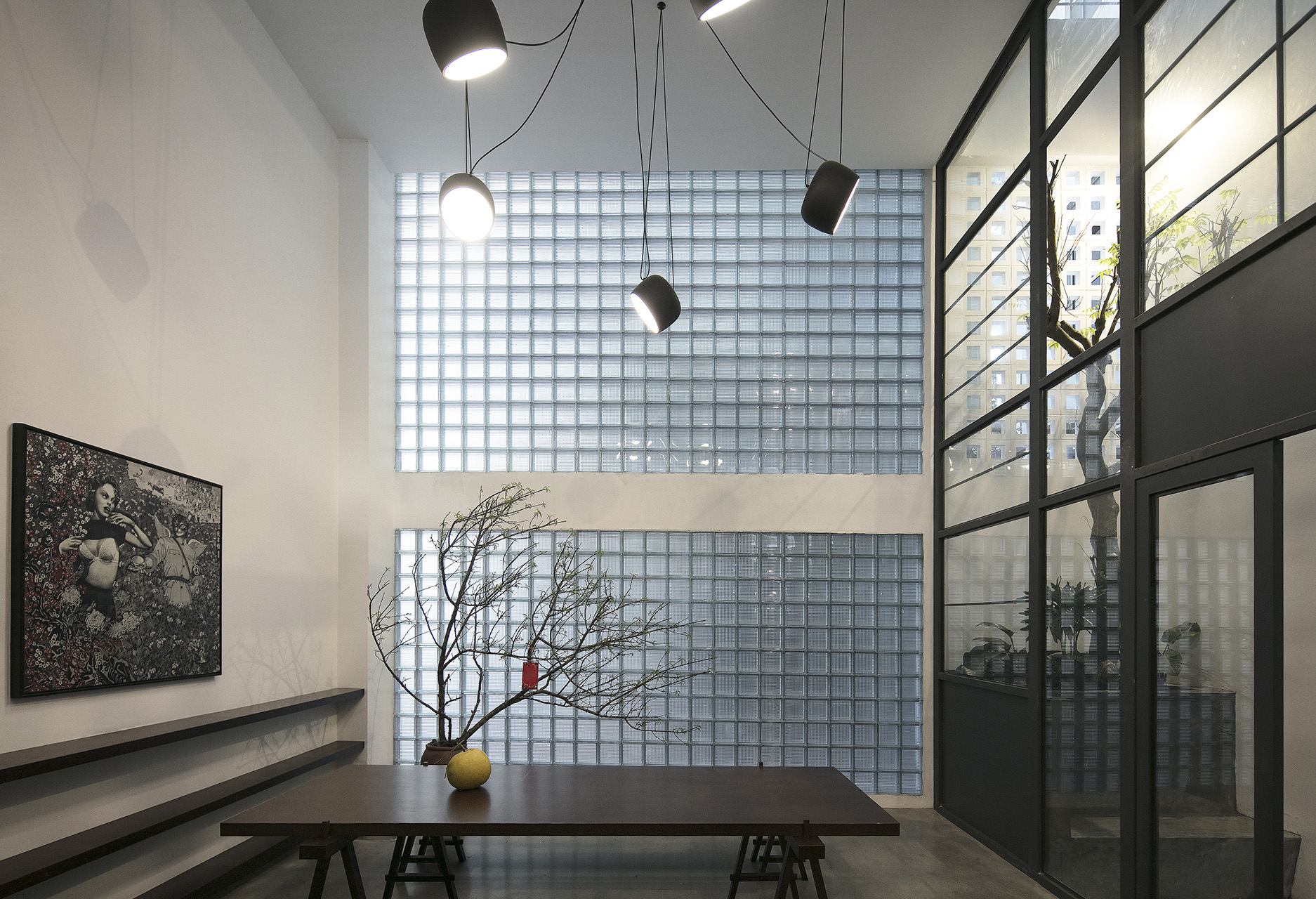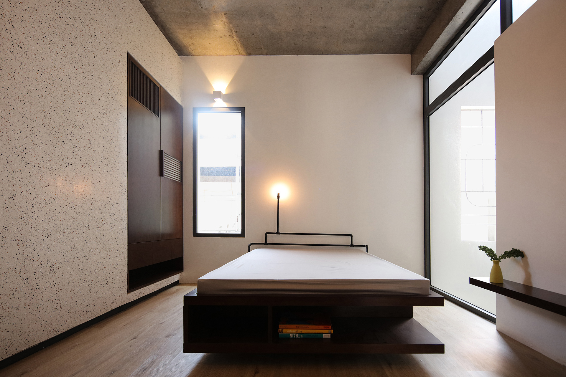 Không gian sinh hoạt chung tầng một với chiều cao 6,5m, kết nối với khoảng vườn sân trong và liên thông với tầng lửng. Tầng lửng là một không gian linh hoạt đa năng – nơi người trong toà nhà có thể tổ chức triển lãm, mở các lớp học kỹ năng hay những buổi nói chuyện chuyên đề… Phần phía trên, từ tầng 2 đến tầng 7 là các không gian căn hộ khép kín. Mỗi căn hộ dù lớn hay nhỏ đều được thiết kế đầy đủ tiện nghi, tràn ngập ánh sáng và thông thoáng tự nhiên, gồm cả những không gian cơ bản và thêm khoảng ban công đặc biệt. Phần ban công này được chúng tôi tổ hợp giữa không gian trong và ngoài nhà, nơi vừa là không gian nghỉ ngơi thư giãn, cũng là không gian đọc sách, không gian cây xanh…