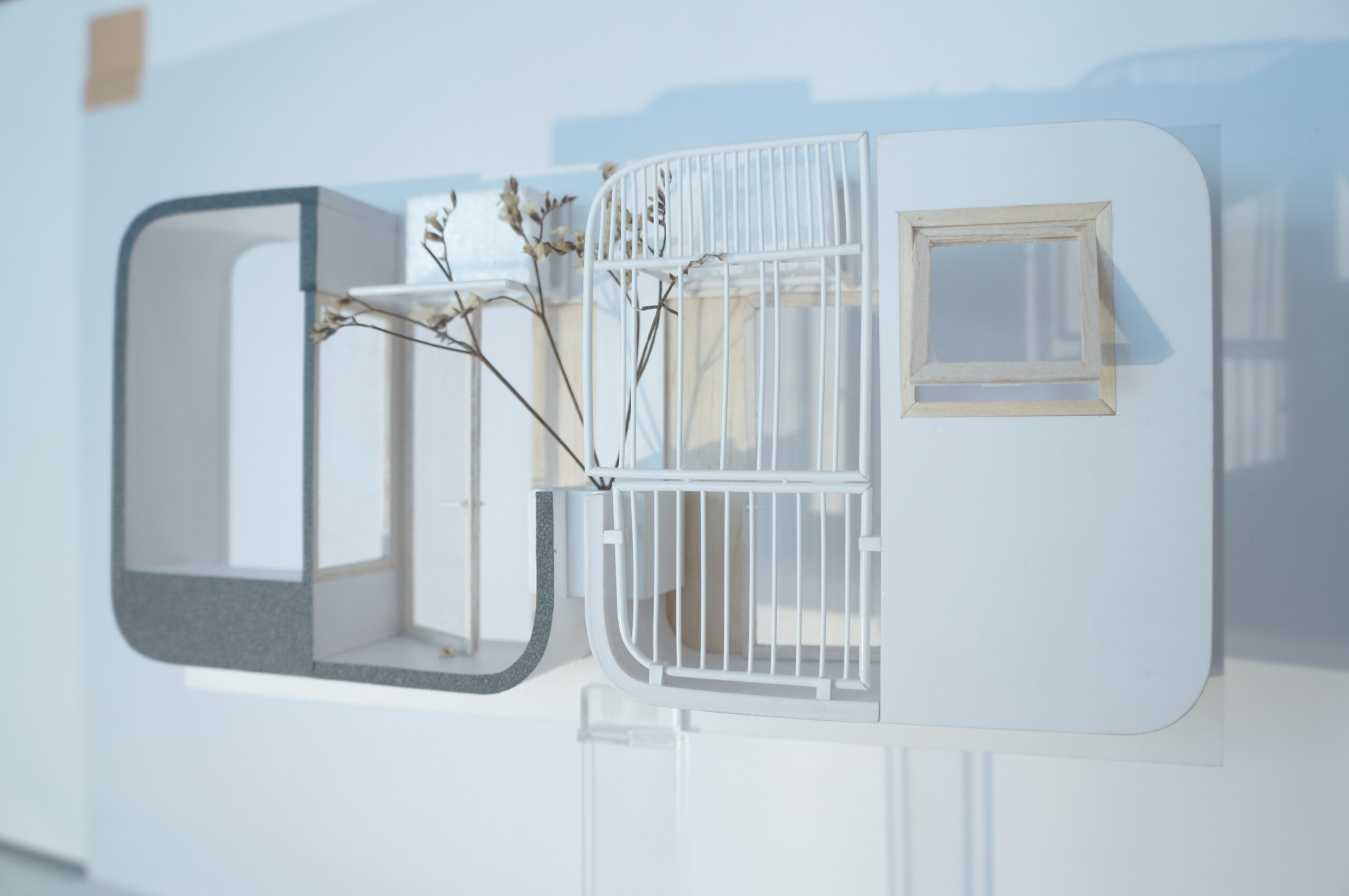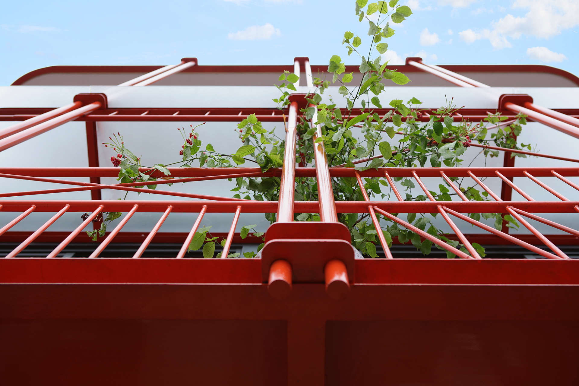 Đối với các căn hộ phía đằng trước, ban công là các phần không gian mở rộng ra ngoài nhà, thì với các căn hộ đằng sau, ban công được thiết kế “lơ lửng” trong khoảng không gian vườn thông tầng của tòa nhà, những người sống tại các căn hộ liền kề có thể liên hệ với nhau qua những tán cây xanh. Về mặt khí hậu, những chiếc ban công này giống như một lớp không gian đệm, bảo vệ không gian chính trong căn hộ khỏi tác động trực tiếp của ánh nắng hướng Tây. Các nét cong được nghiên cứu trong nội thất cũng được biểu hiện ngoài mặt tiền, tạo nên một ngôn ngữ đặc trưng cho công trình.
