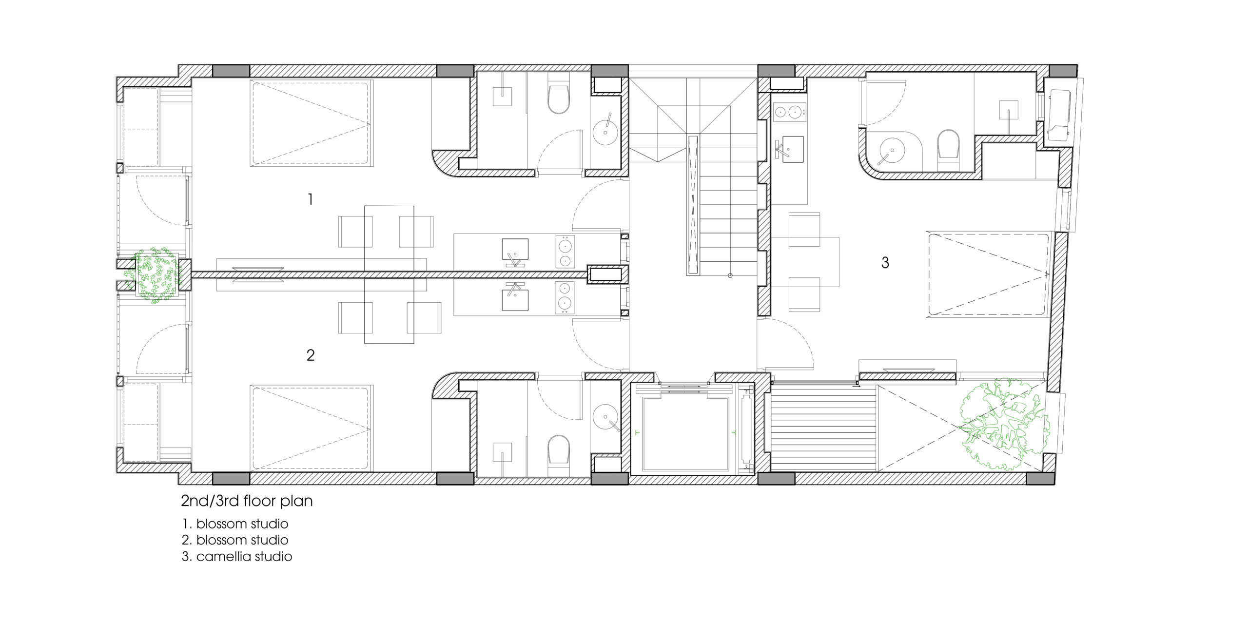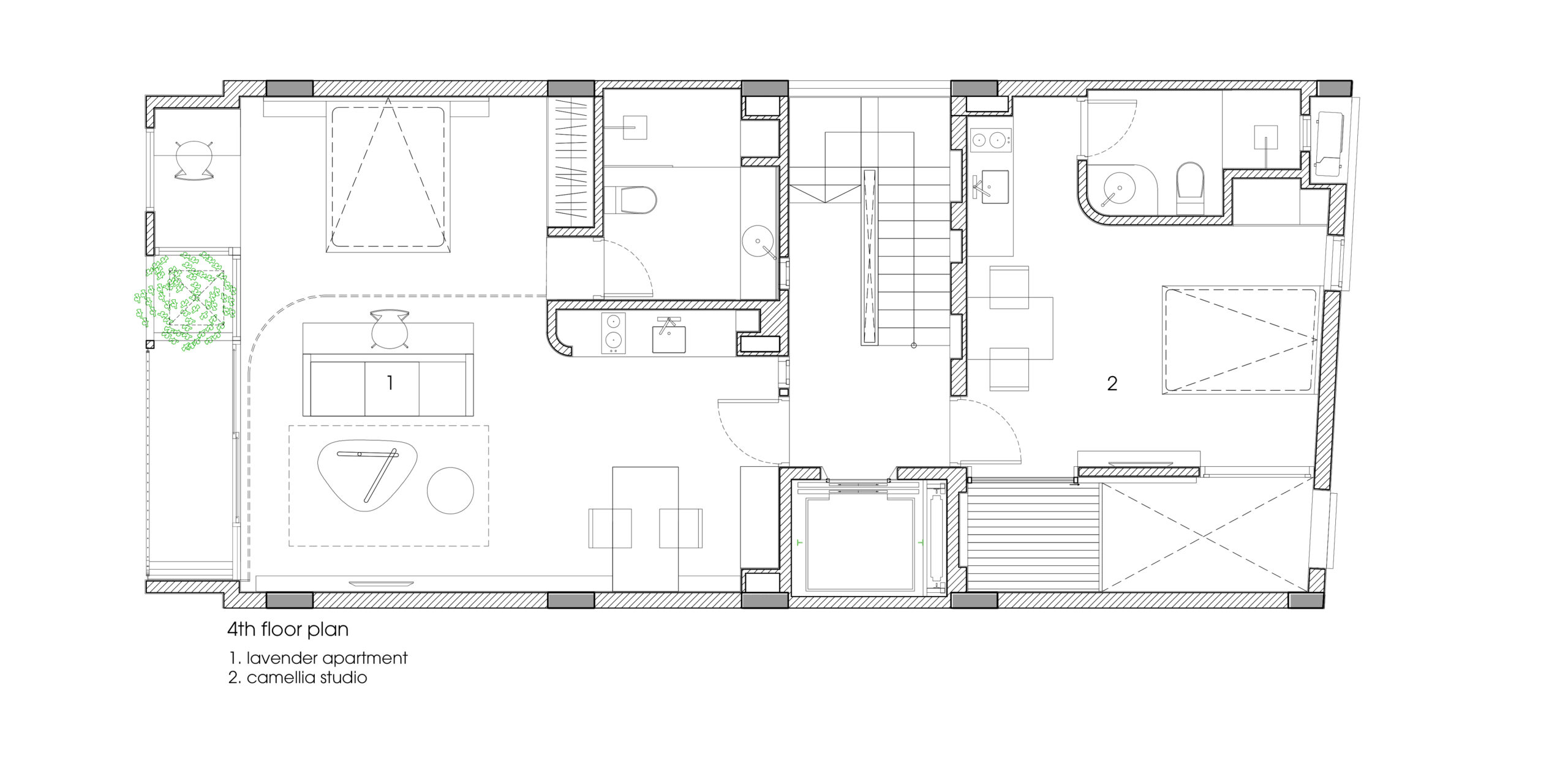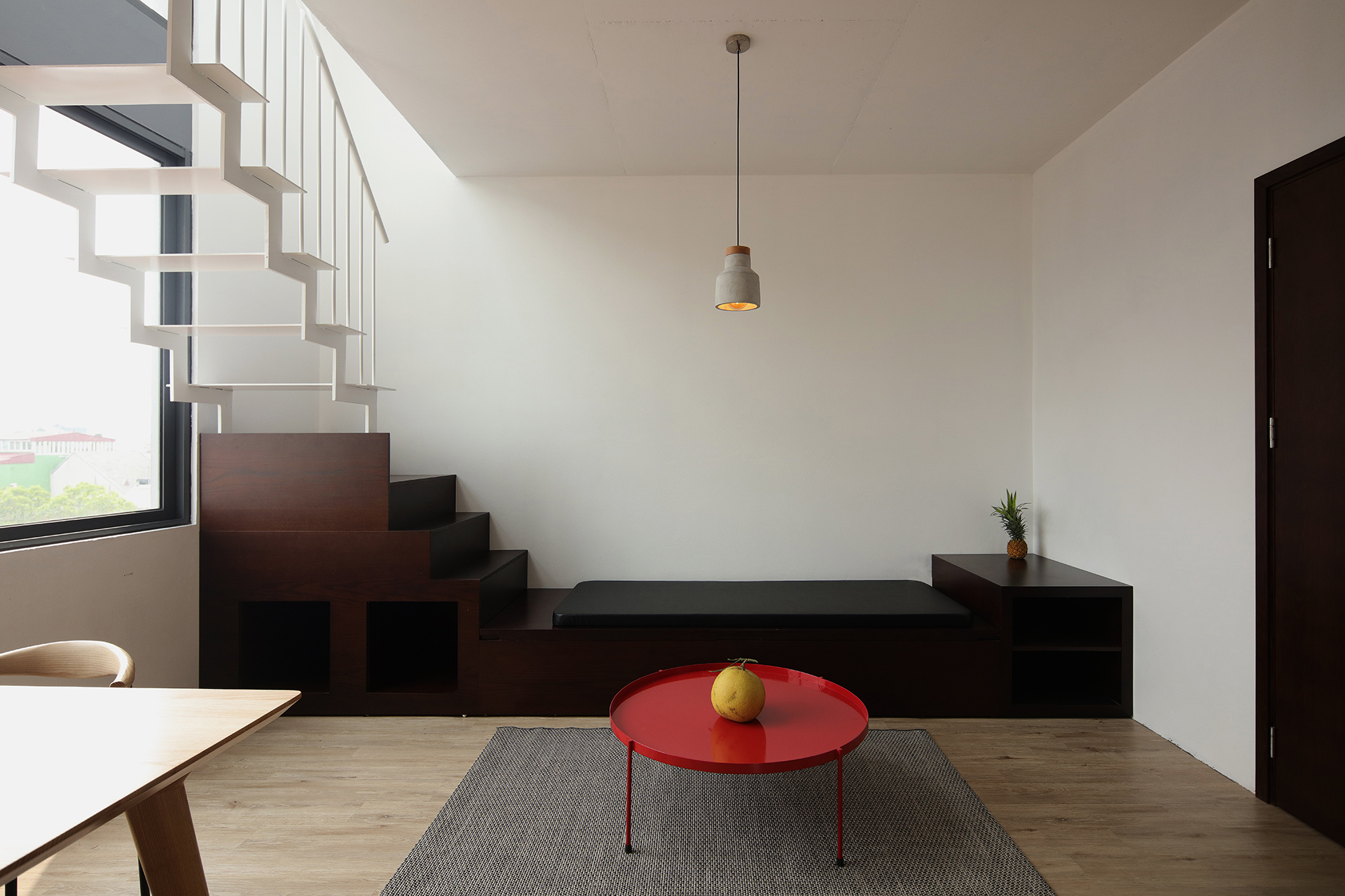 With coherent structure, we organize different layers of space, from public spaces, semi-public spaces and private spaces. The base of the building includes the first floor and mezzanine designed for community space. From the 2nd to 7th floor there are different types of apartment. On the second and third floors there are small-sized studios. On the 4th floor there is a big-sized studio and on the 5th, 6th and 7th floors are duplex. Diversifying the types of apartments helps guests to easily choose for themselves the most suitable space. Each apartment is designed with full amenities, light and natural ventilation.