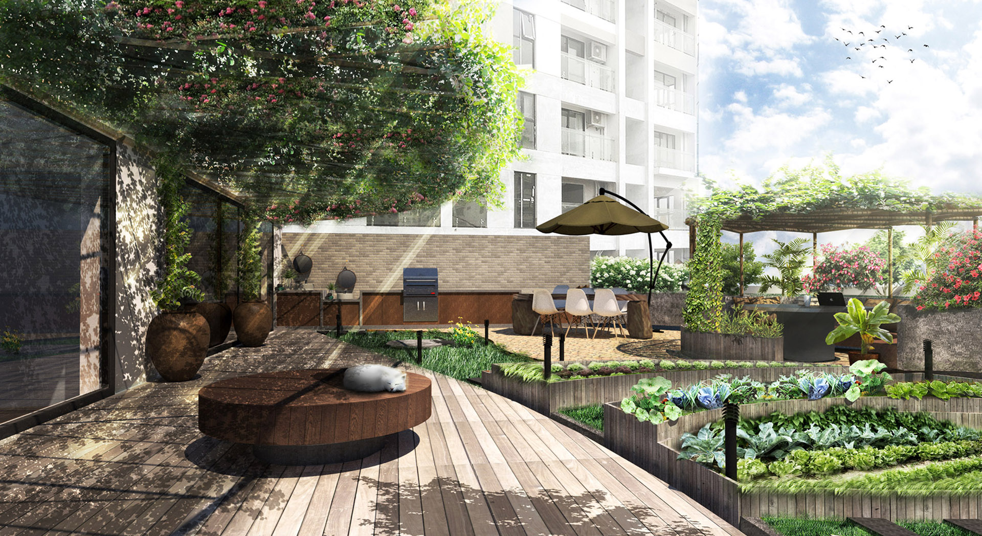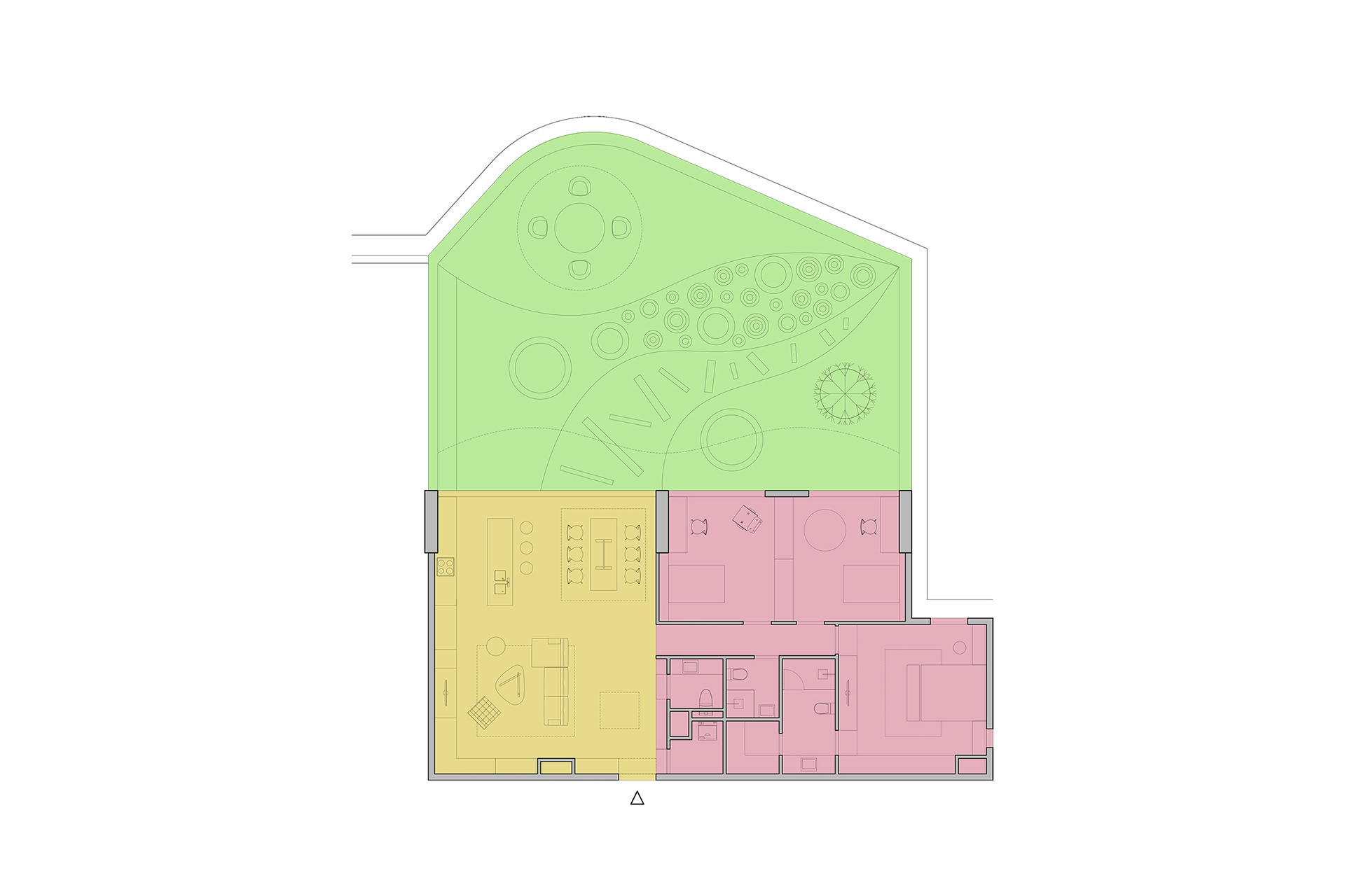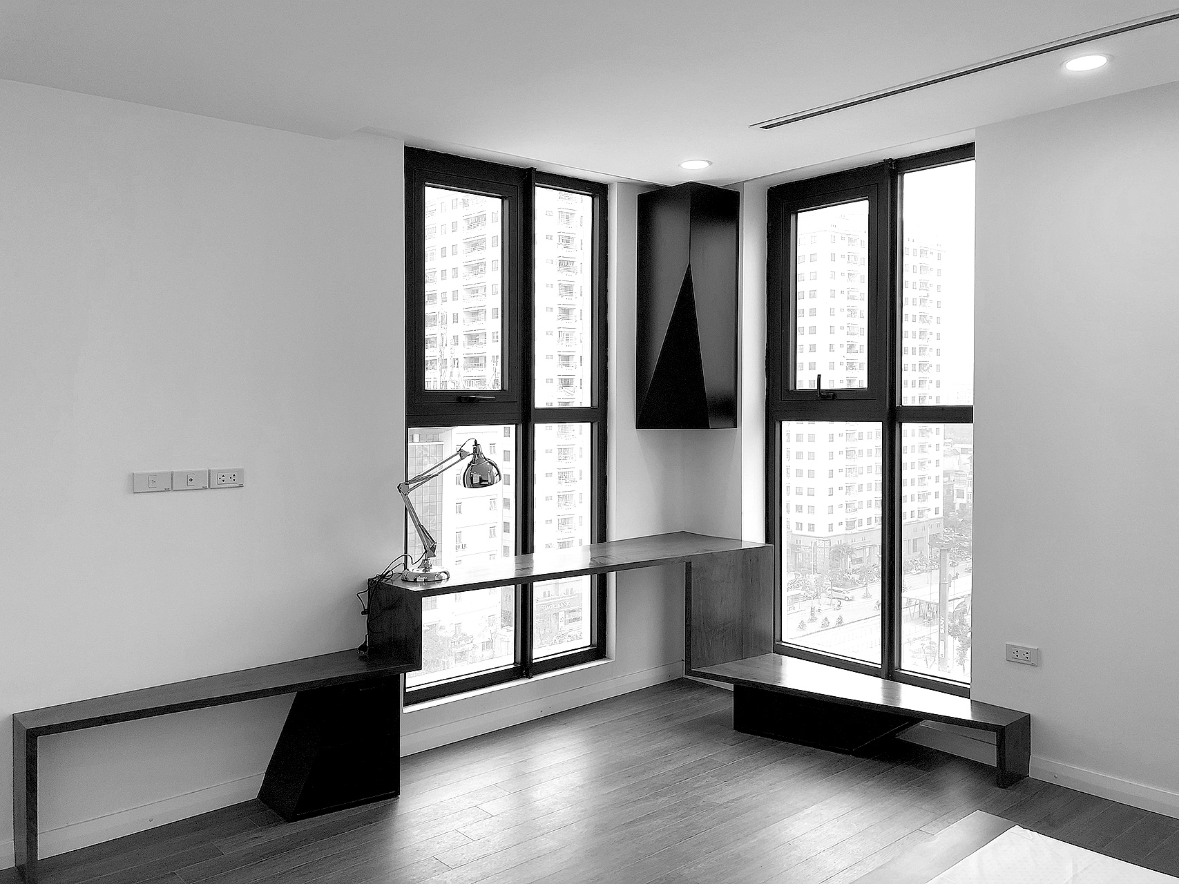 Căn hộ mới được cơ cấu lại các không gian chức năng, khi hai căn hộ cũ được chuyển đổi thành không gian sinh hoạt chung và không gian riêng tư một cách rõ rệt. Cả hai không gian mới này đều tiếp xúc trực tiếp với cảnh quan bên ngoài. Hệ thống đồ nội thất trong căn hộ được thiết kế để không chỉ đảm bảo các công năng sử dụng, mà còn có tác dụng liên kết không gian trong và ngoài. Cùng với hệ trần giả, tất cả tạo nên một hình thái kiến trúc rất riêng cho căn hộ. Không giống như những căn hộ khác, phần cảnh quan sân ngoài trong dự án này là một yếu tố nổi bật, mang tính đặc trưng riêng. Tổ chức không gian cảnh quan được thiết lập theo ý tưởng mở rộng ra bên ngoài từ các không gian nội thất. Trái ngược với bố cục khá vuông vức và chặt chẽ của không gian nội thất, cảnh quan ở đây được tạo bởi những nét cong tự nhiên và ẩn chứa nhiều “khung cảnh” khác nhau ở từng góc nhìn.