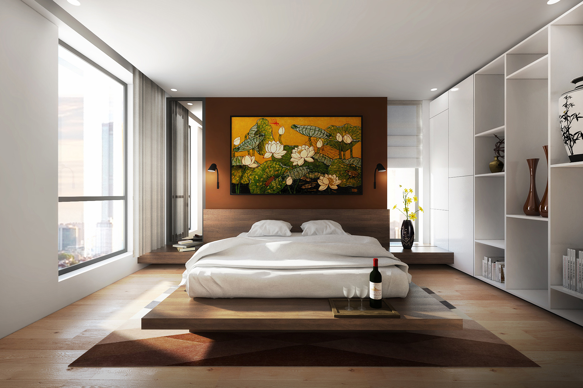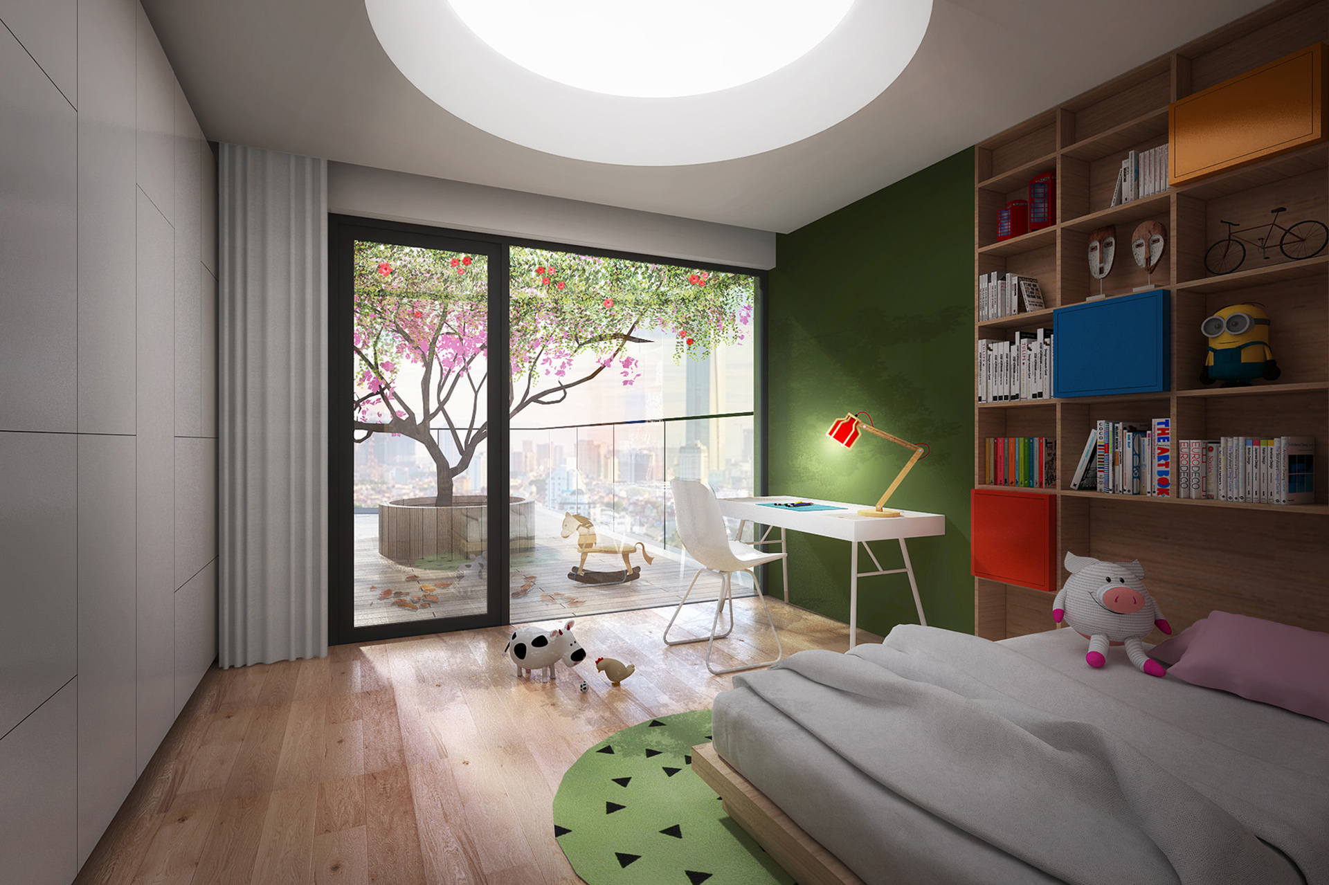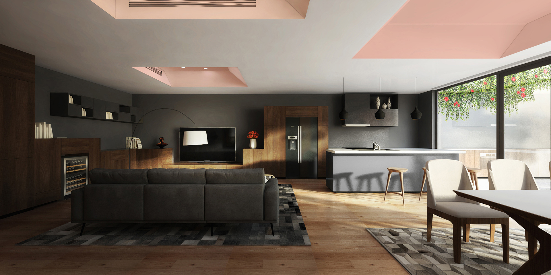 Căn hộ mới được cơ cấu lại các không gian chức năng, khi hai căn hộ cũ được chuyển đổi thành không gian sinh hoạt chung và không gian riêng tư một cách rõ rệt. Cả hai không gian mới này đều tiếp xúc trực tiếp với cảnh quan bên ngoài. Hệ thống đồ nội thất trong căn hộ được thiết kế để không chỉ đảm bảo các công năng sử dụng, mà còn có tác dụng liên kết không gian trong và ngoài. Cùng với hệ trần giả, tất cả tạo nên một hình thái kiến trúc rất riêng cho căn hộ. Không giống như những căn hộ khác, phần cảnh quan sân ngoài trong dự án này là một yếu tố nổi bật, mang tính đặc trưng riêng. Tổ chức không gian cảnh quan được thiết lập theo ý tưởng mở rộng ra bên ngoài từ các không gian nội thất. Trái ngược với bố cục khá vuông vức và chặt chẽ của không gian nội thất, cảnh quan ở đây được tạo bởi những nét cong tự nhiên và ẩn chứa nhiều “khung cảnh” khác nhau ở từng góc nhìn.