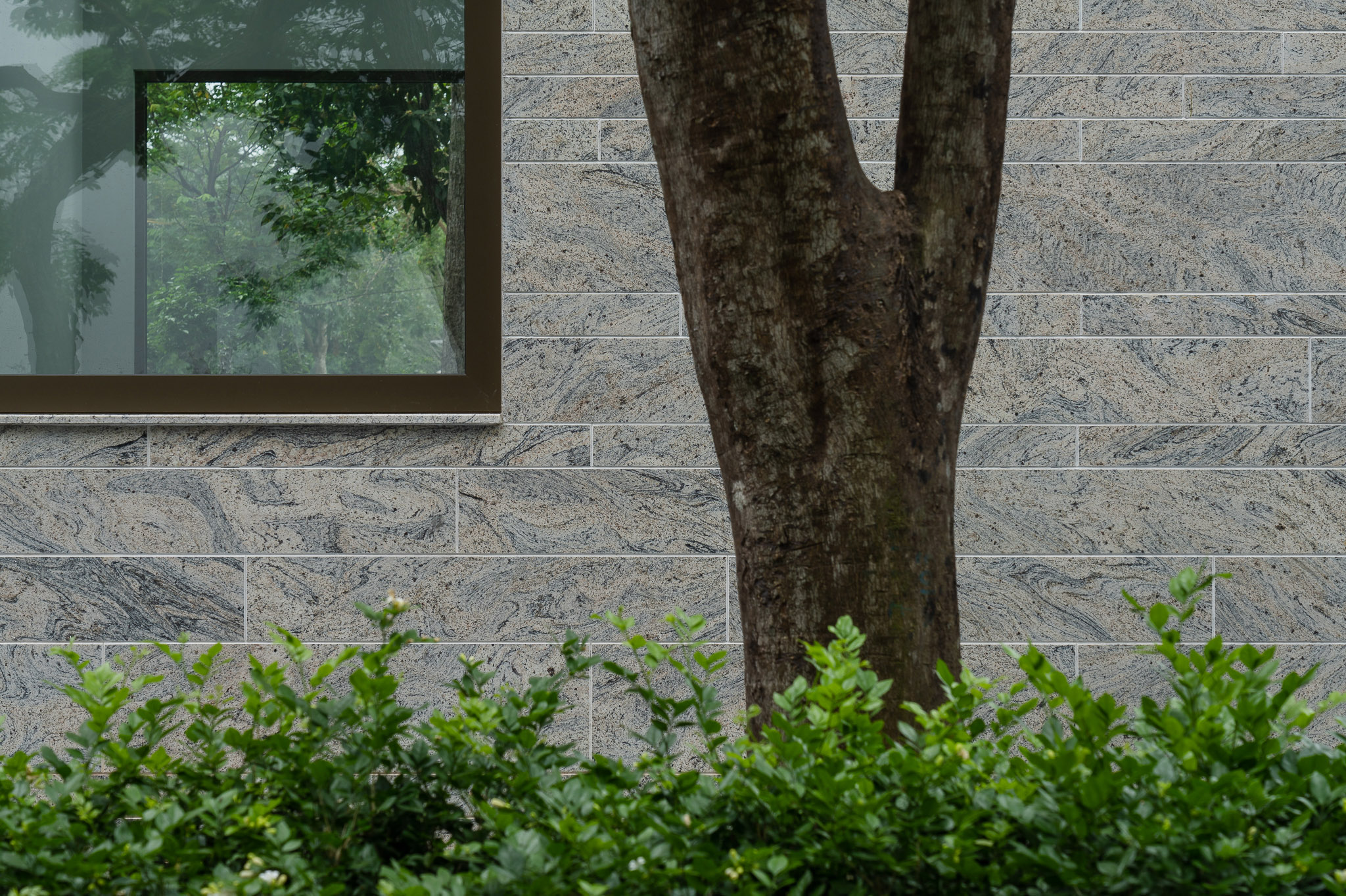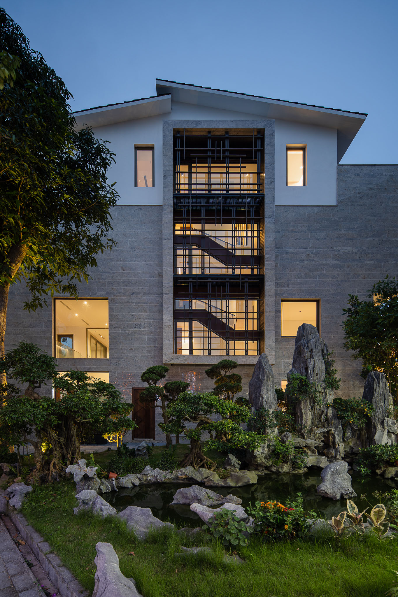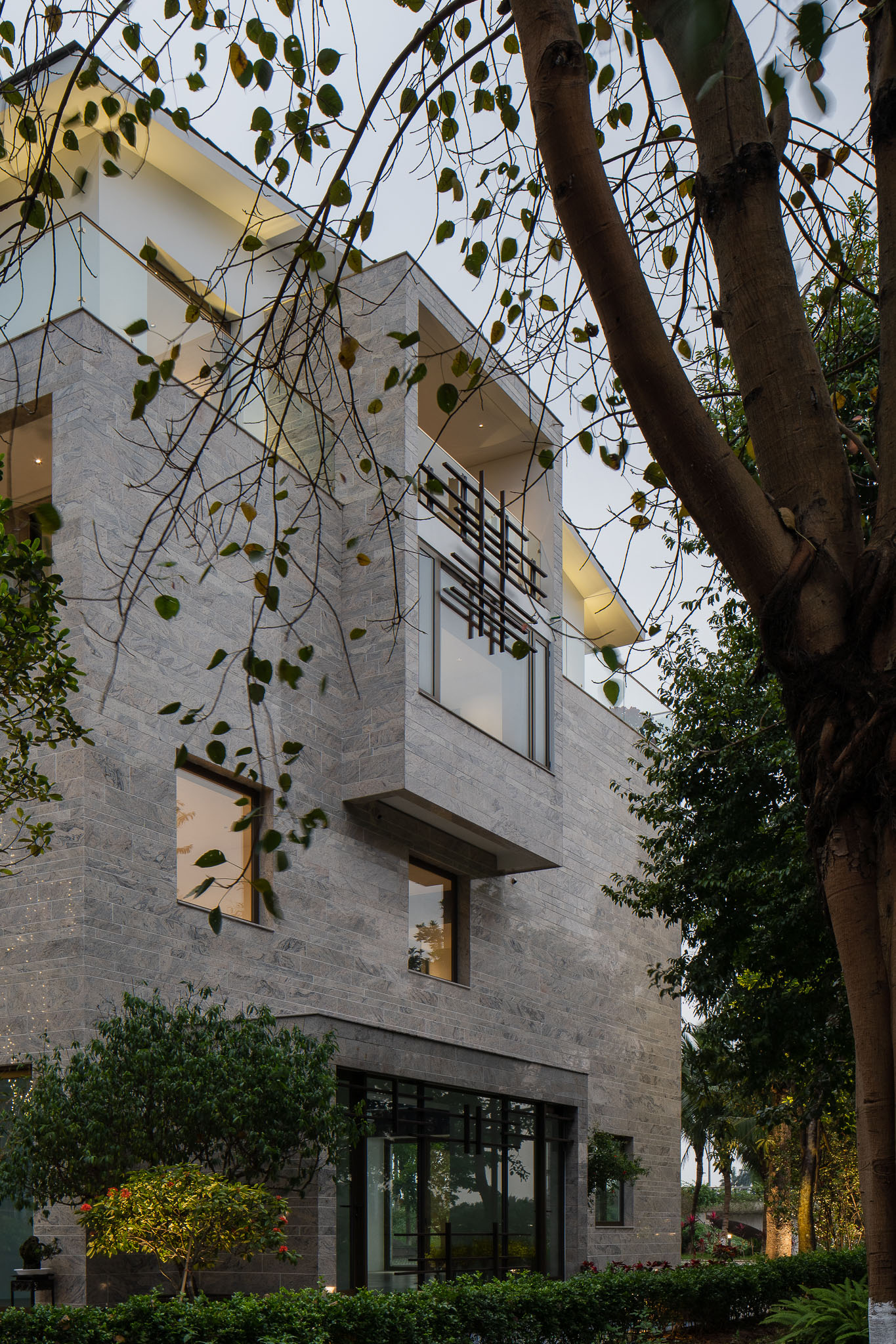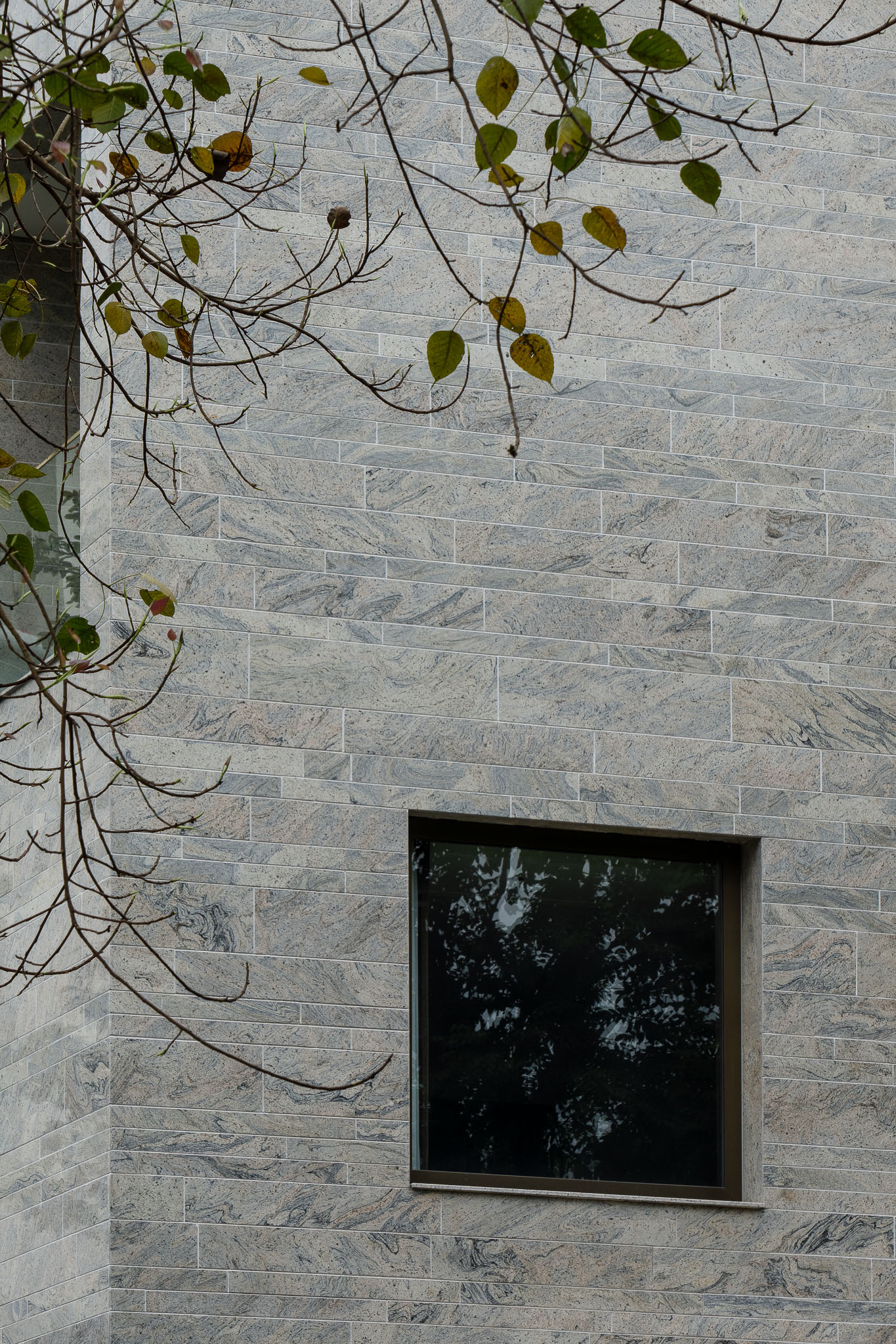 Một số các ô mở được chúng tôi tạo ra chứa đựng cả những công năng trong đó. Chính hình khối của các không gian này tác động trực tiếp lên mặt tiền. Chúng cấu trúc lại tổng thể hình khối ngôi nhà một cách mạch lạc hơn. Thêm vào đó, công trình được khoác lên mình một lớp áo mới bằng vật liệu đá tự nhiên. Sự tổ hợp của các tấm đá trên mặt ngoài của ngôi nhà, cùng với tông màu và hoa văn của chúng tạo ra các cuộc đối thoại với cây cỏ thiên nhiên một cách thú vị tùy vào thời gian trong ngày, tùy vào thời tiết trong năm. Ngôi nhà như một “vật thể” độc lập vừa có cá tính riêng, nhưng cũng vừa tương tác mật thiết với bối cảnh của khu vực.