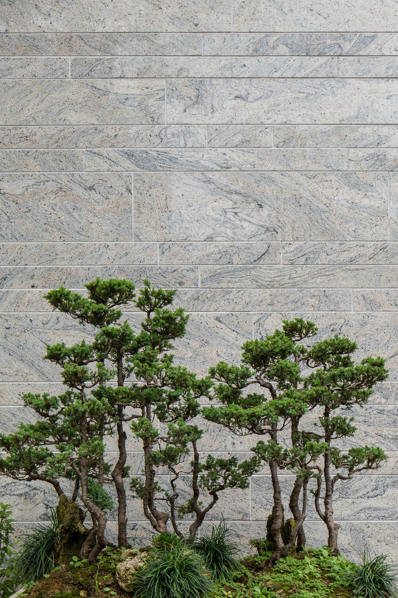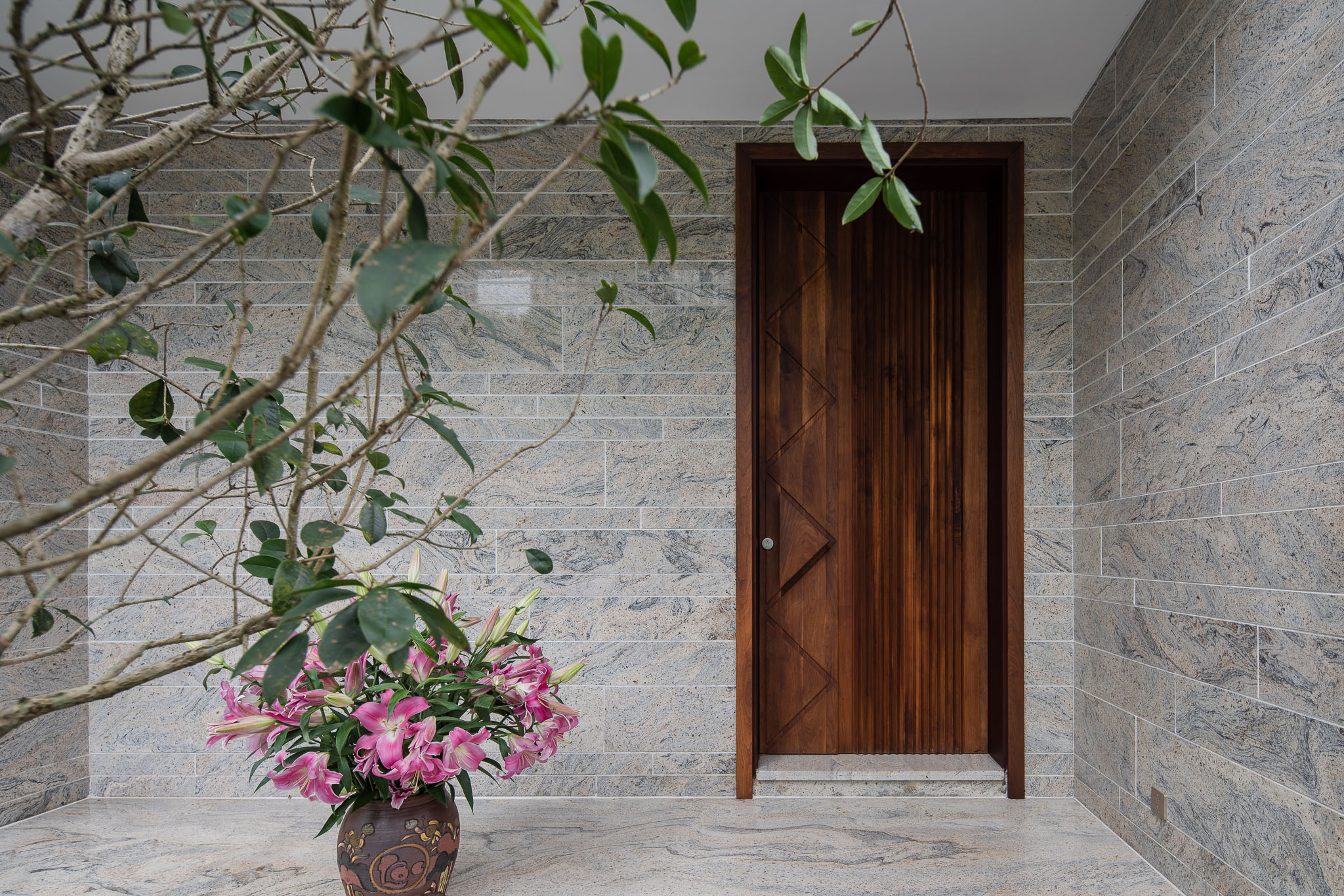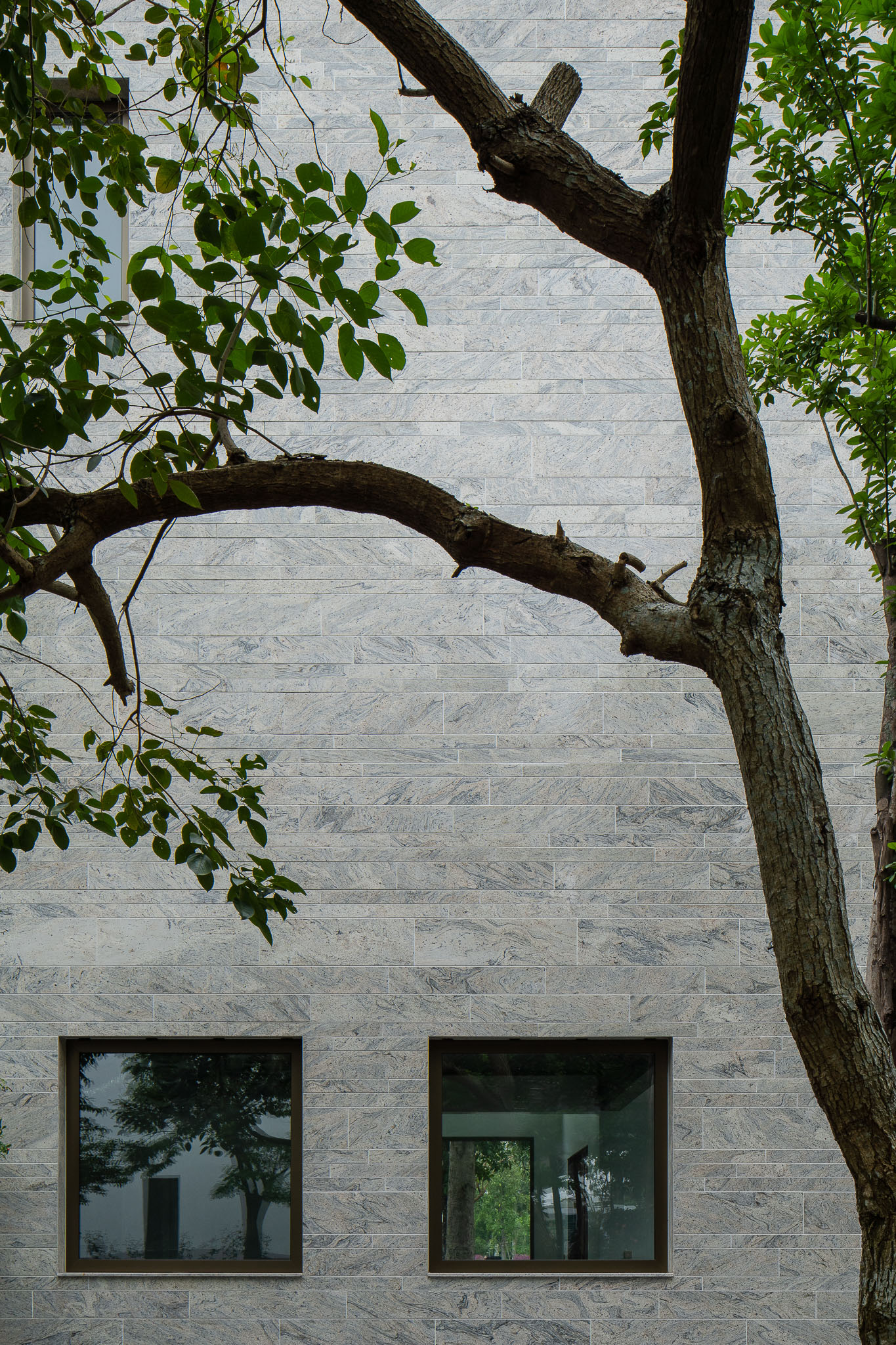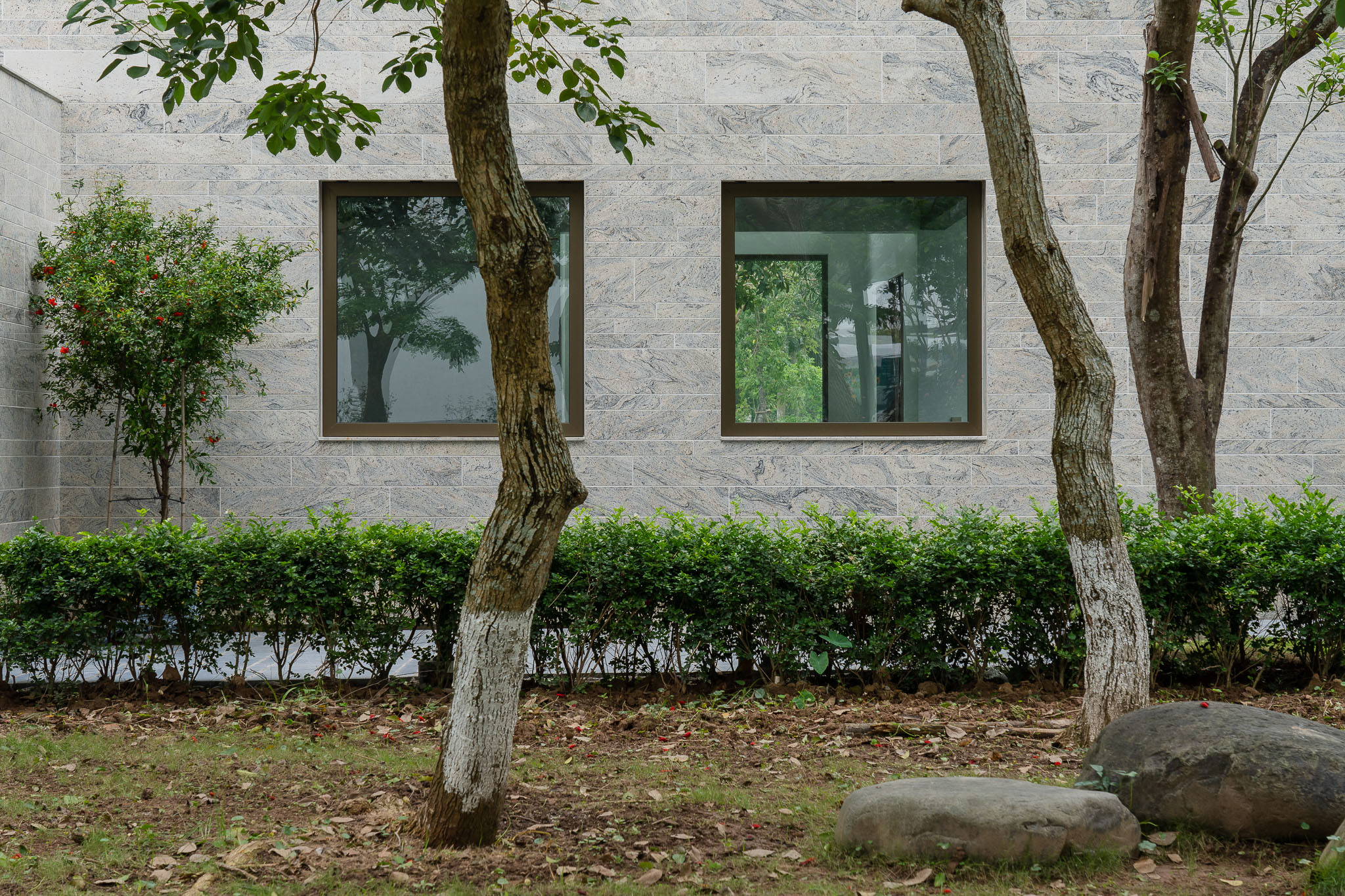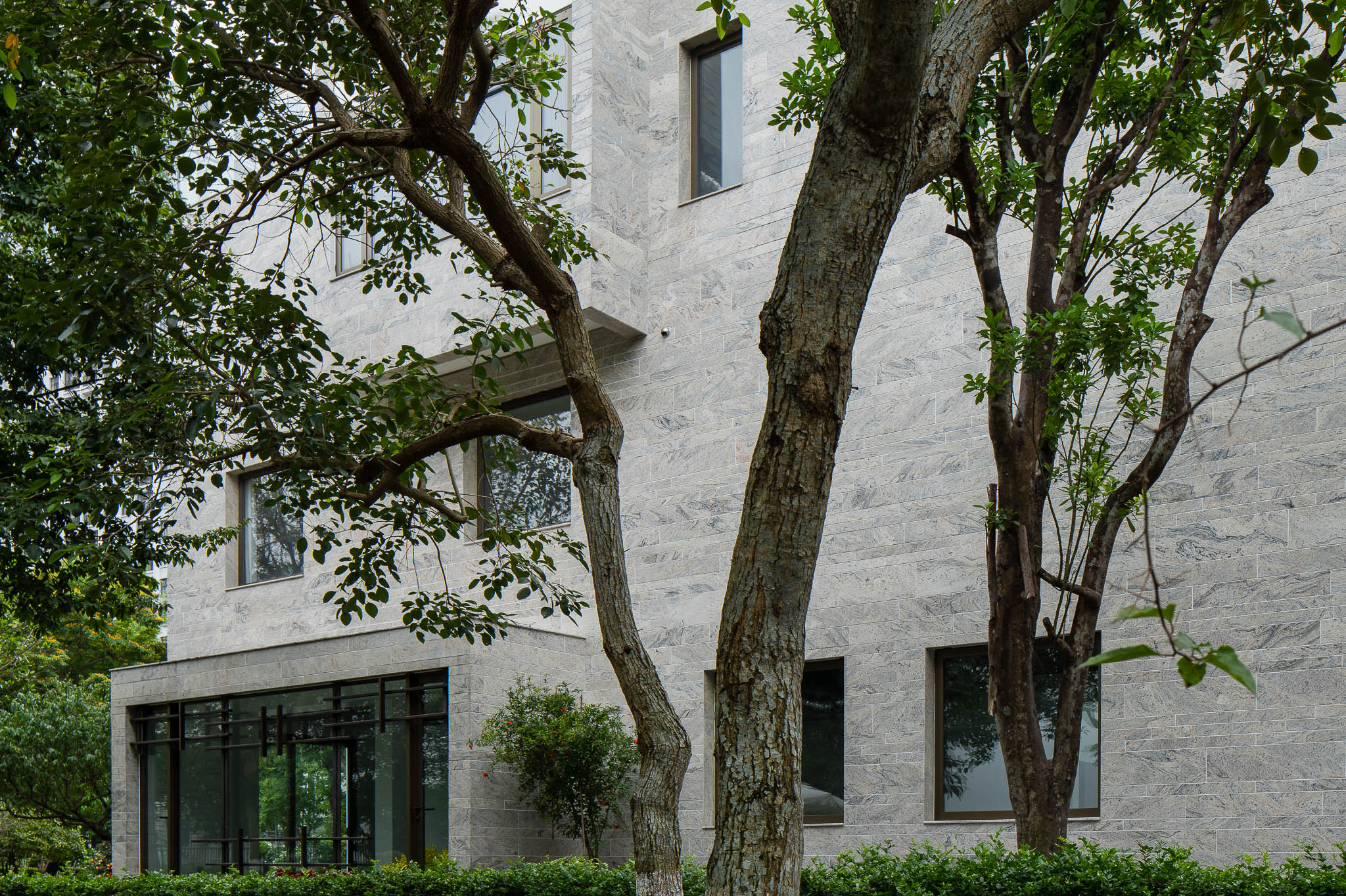 Một số các ô mở được chúng tôi tạo ra chứa đựng cả những công năng trong đó. Chính hình khối của các không gian này tác động trực tiếp lên mặt tiền. Chúng cấu trúc lại tổng thể hình khối ngôi nhà một cách mạch lạc hơn. Thêm vào đó, công trình được khoác lên mình một lớp áo mới bằng vật liệu đá tự nhiên. Sự tổ hợp của các tấm đá trên mặt ngoài của ngôi nhà, cùng với tông màu và hoa văn của chúng tạo ra các cuộc đối thoại với cây cỏ thiên nhiên một cách thú vị tùy vào thời gian trong ngày, tùy vào thời tiết trong năm. Ngôi nhà như một “vật thể” độc lập vừa có cá tính riêng, nhưng cũng vừa tương tác mật thiết với bối cảnh của khu vực.