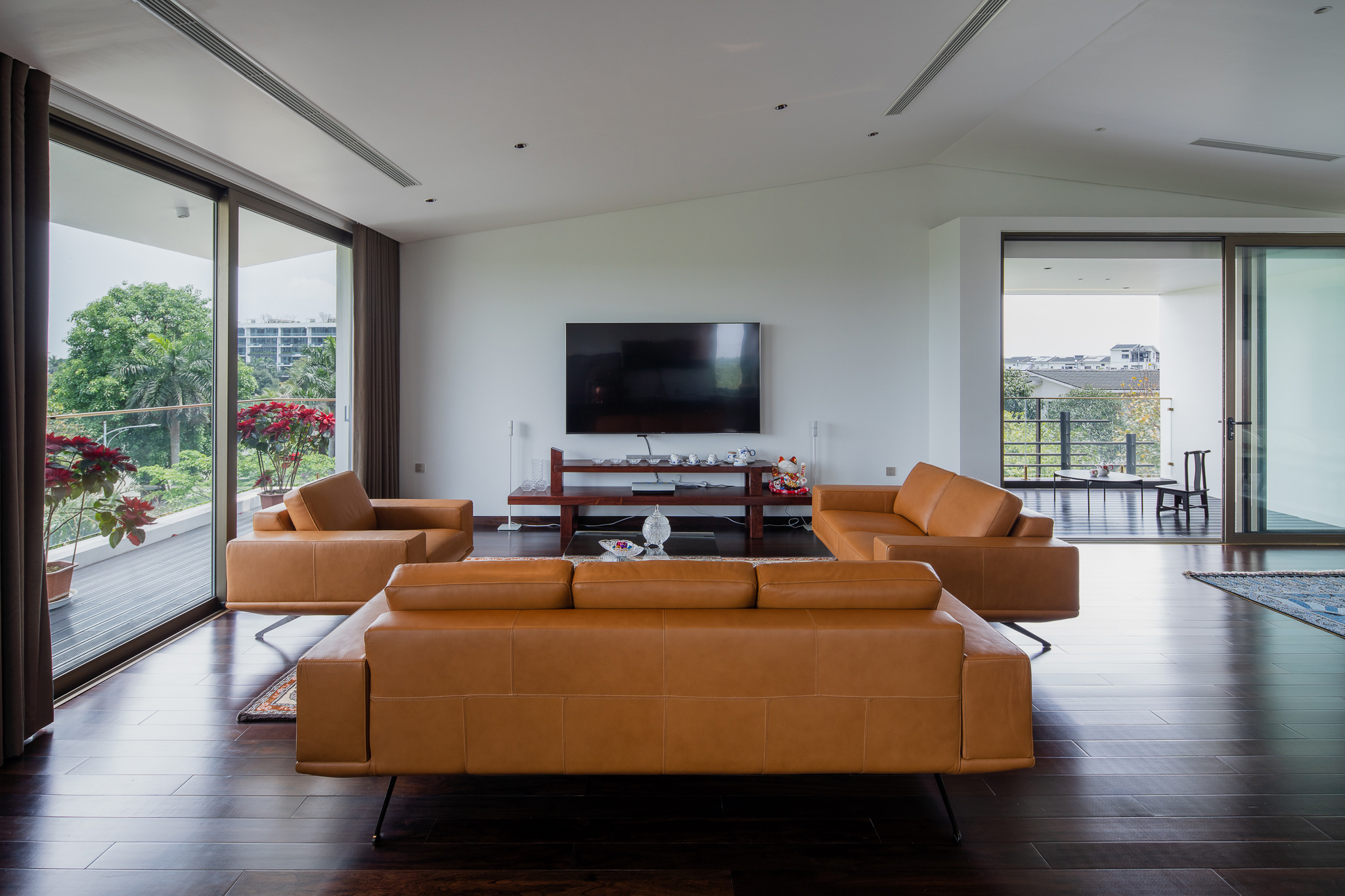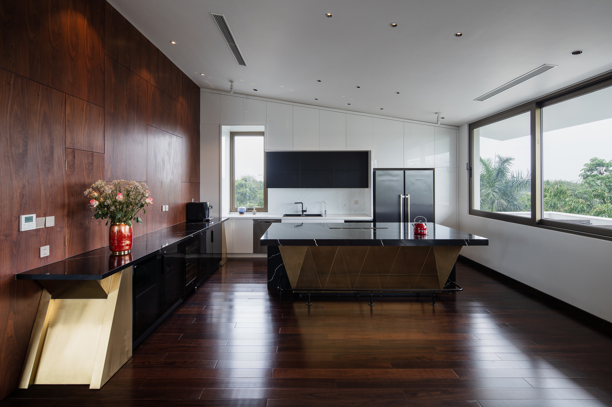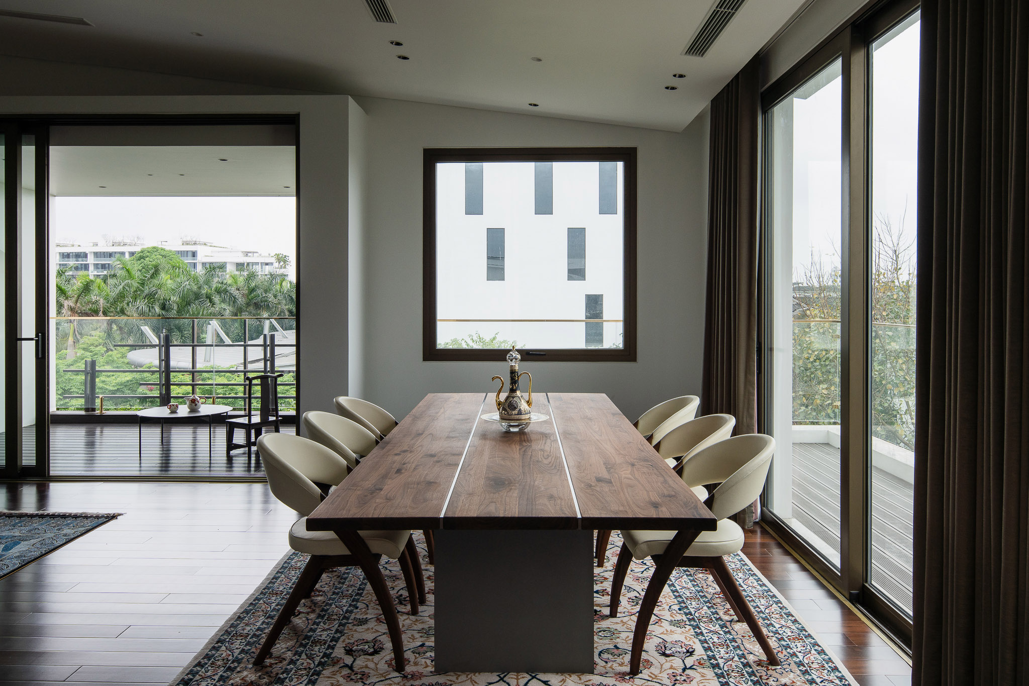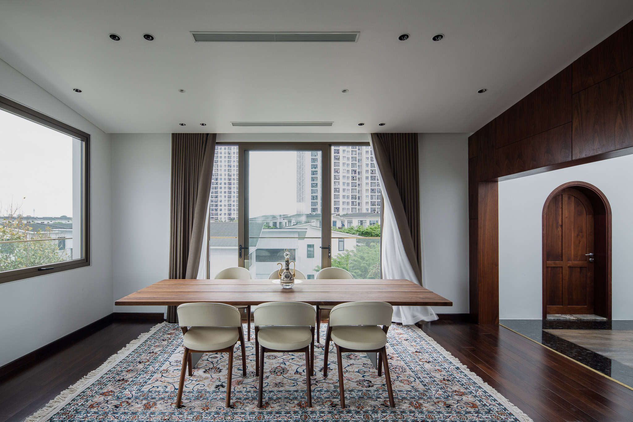 YU house was a rough-built villa, located in the project of Ecopark urban area. Located in a rather special position, at the corner point of the house and garden complex, the building has four open sides. Most of the viewing points are facing the green landscape and the lake. Unfortunately, it was also designed as a tract home, having the same style as houses in other locations, a common problem of new urban areas. So, the apparent question for us is how to exploit all the interesting natural scenery that the house has, and at the same time, based on the rough building block, taking measures to still create unique features for the architecture of the building, but without disrupting the overall stability of the area.