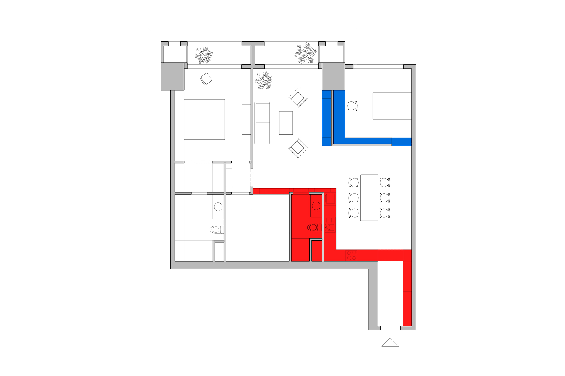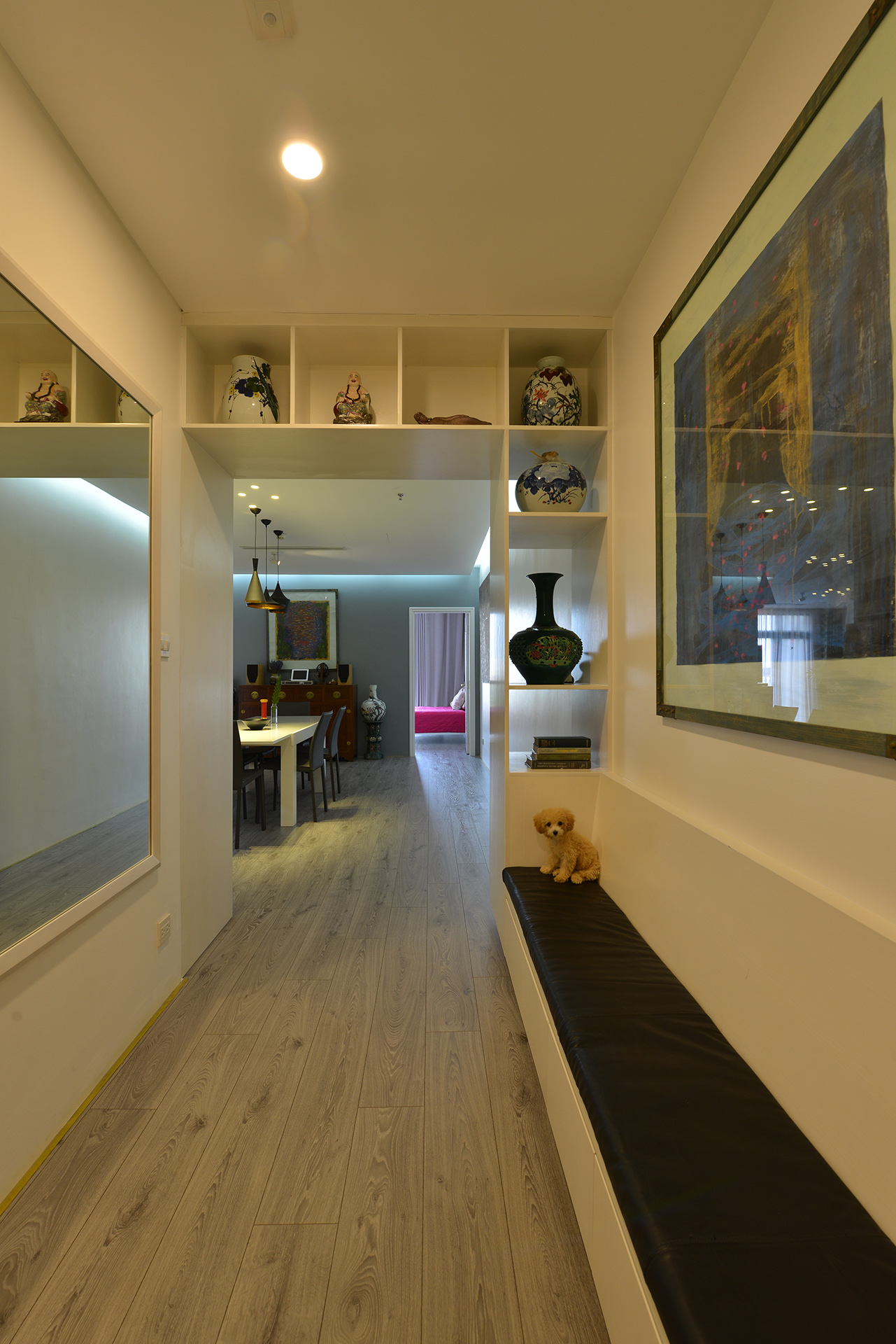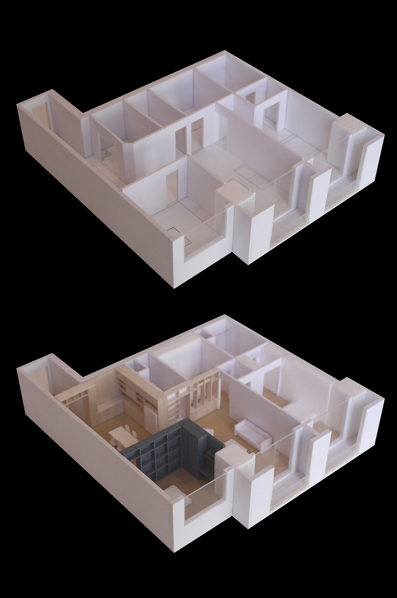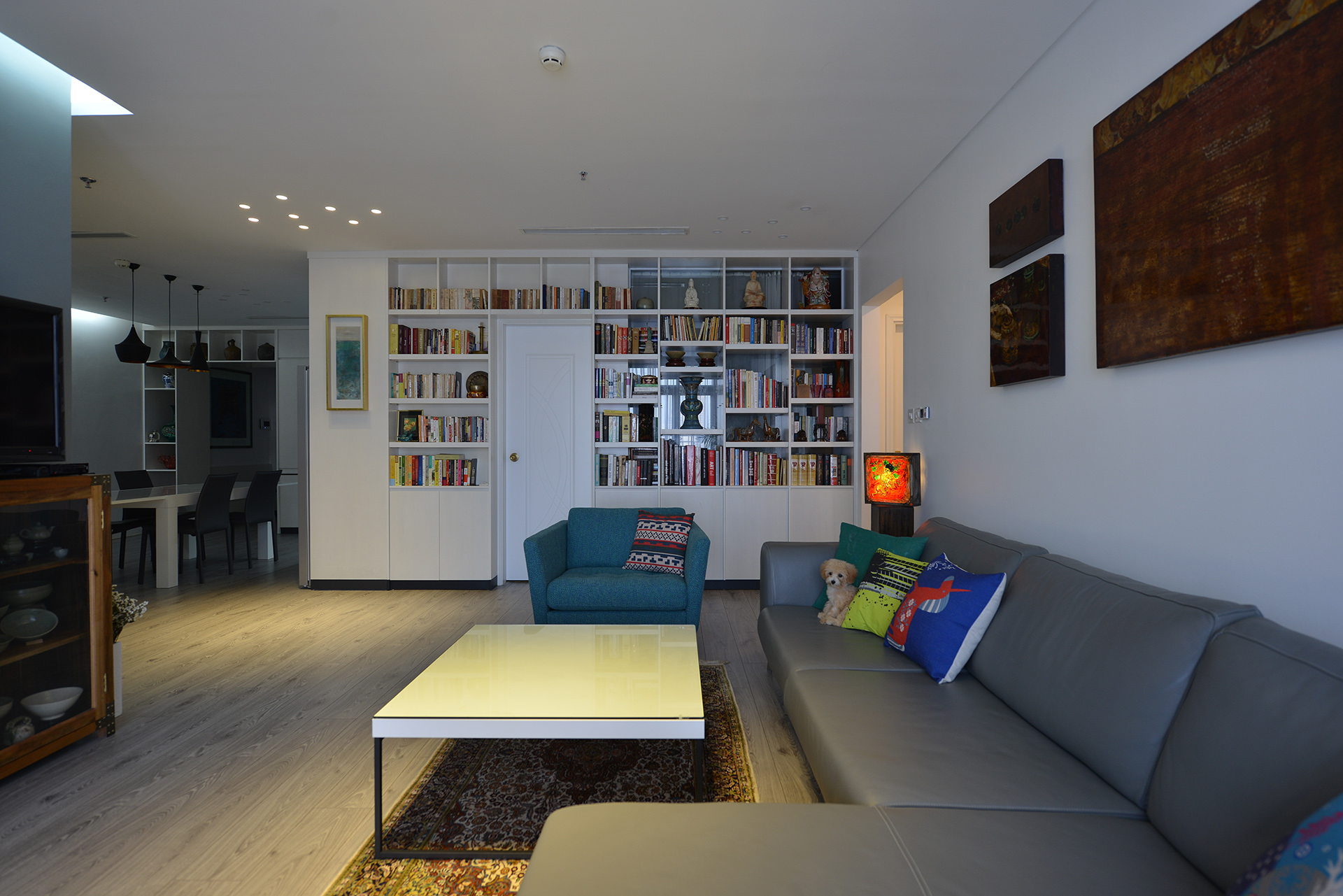 Đây là dự án cải tạo một căn hộ chung cư dành cho gia đình có ba thế hệ tại khu chung cư Royal City, Thanh Xuân, Hà Nội, cũng là dự án thứ 5 chúng tôi áp dụng nguyên lý “đồ nội thất kiến tạo không gian”. Không gian căn hộ trước khi cải tạo có một nhược điểm rất lớn trong điều kiện khí hậu của Việt Nam là có một phòng ngủ hoàn toàn không được chiếu sáng tự nhiên. Bên cạnh đó, các không gian sinh hoạt chung (bếp, ăn, khách) bị chia nhỏ, không liên thông mạch lạc với nhau tạo cảm giác chật chội. Câu hỏi đặt ra là làm thế nào để cải thiện các tiện nghi khí hậu trong các không gian sinh hoạt: chiếu sáng tự và thông gió tự nhiên cũng như mở rộng không gian sịnh hoạt tối đa cho căn hộ mà không can thiệp nhiều vào kết cấu xây dựng đã có từ trước? Giải pháp của chúng tôi là phá dỡ hệ tường xây ngăn chia phòng ngủ bên trong với phòng khách (thay thế bằng hệ tủ trang trí có ô thoáng), tường ngăn chia bếp với phòng ăn nhằm đưa ánh sáng tự nhiên vào sâu trong phòng ngủ, mở rộng không gian sinh hoạt chung, tạo sự thông thoáng. Hệ tủ tường và kệ trang trí kéo dài liên tục trên một phía tường từ tiền sảnh vào phòng khách, bằng công năng của nó, đã xác định nên tính chất các không gian mà nó đi qua, đồng thời là sự kết nối các không gian đó với nhau.