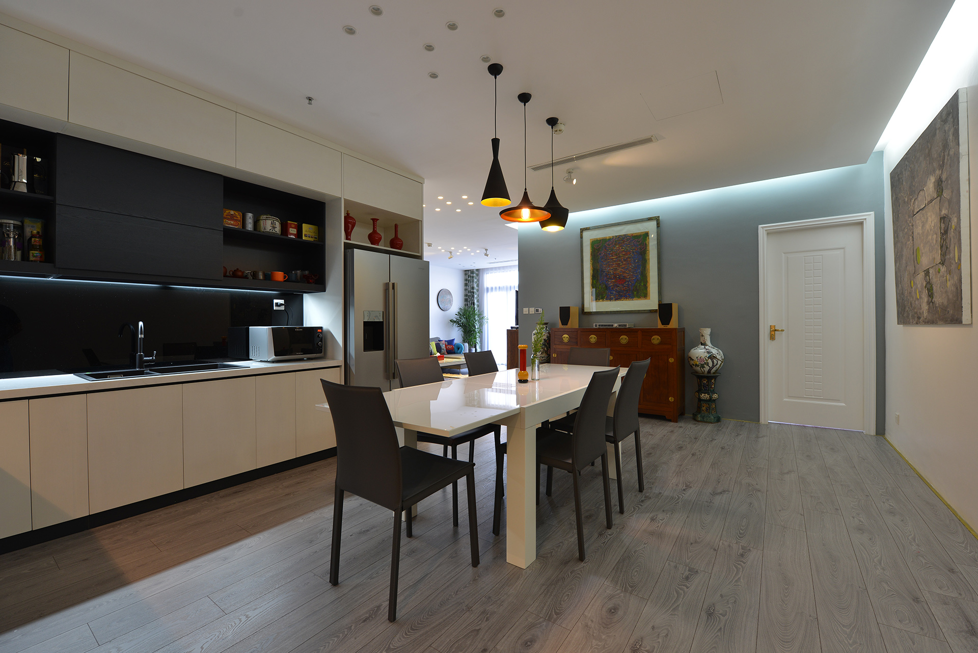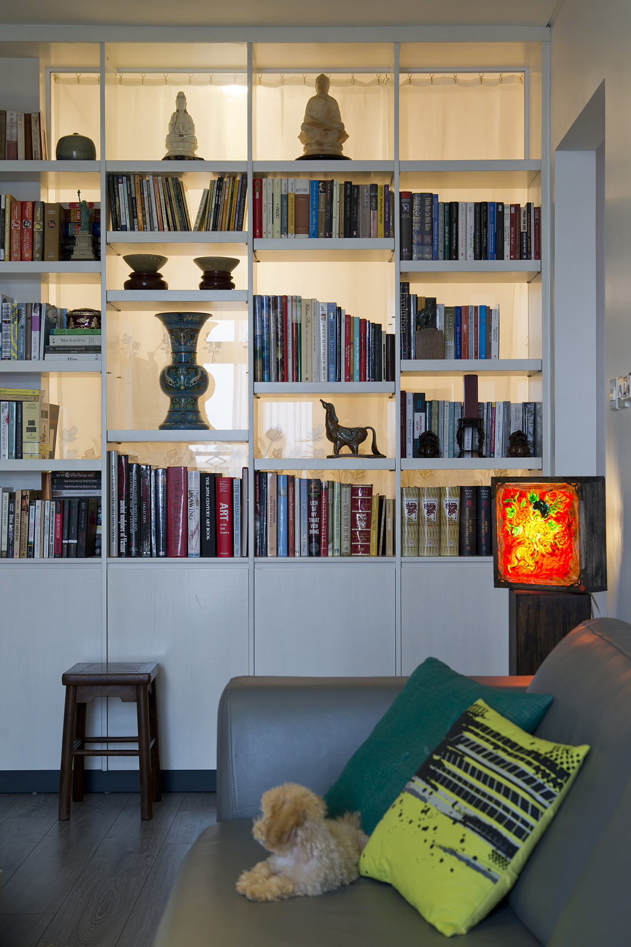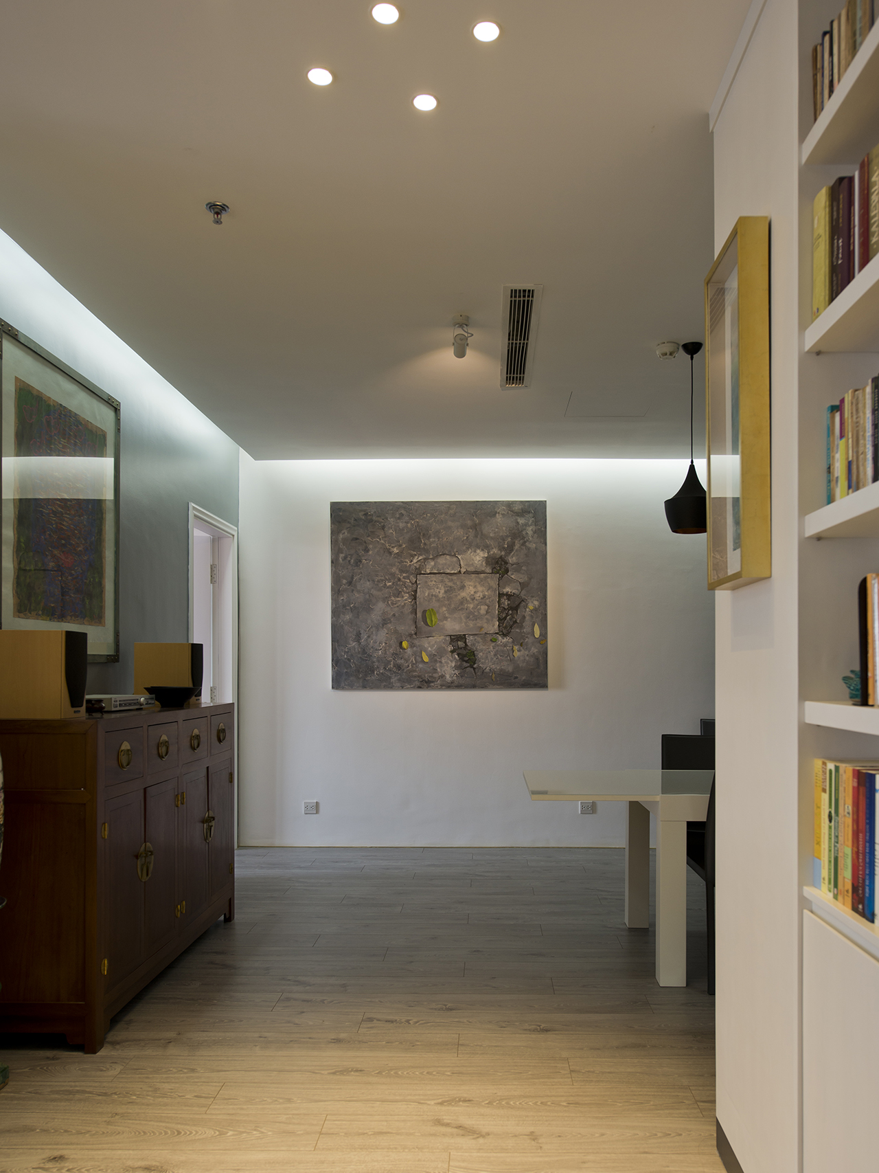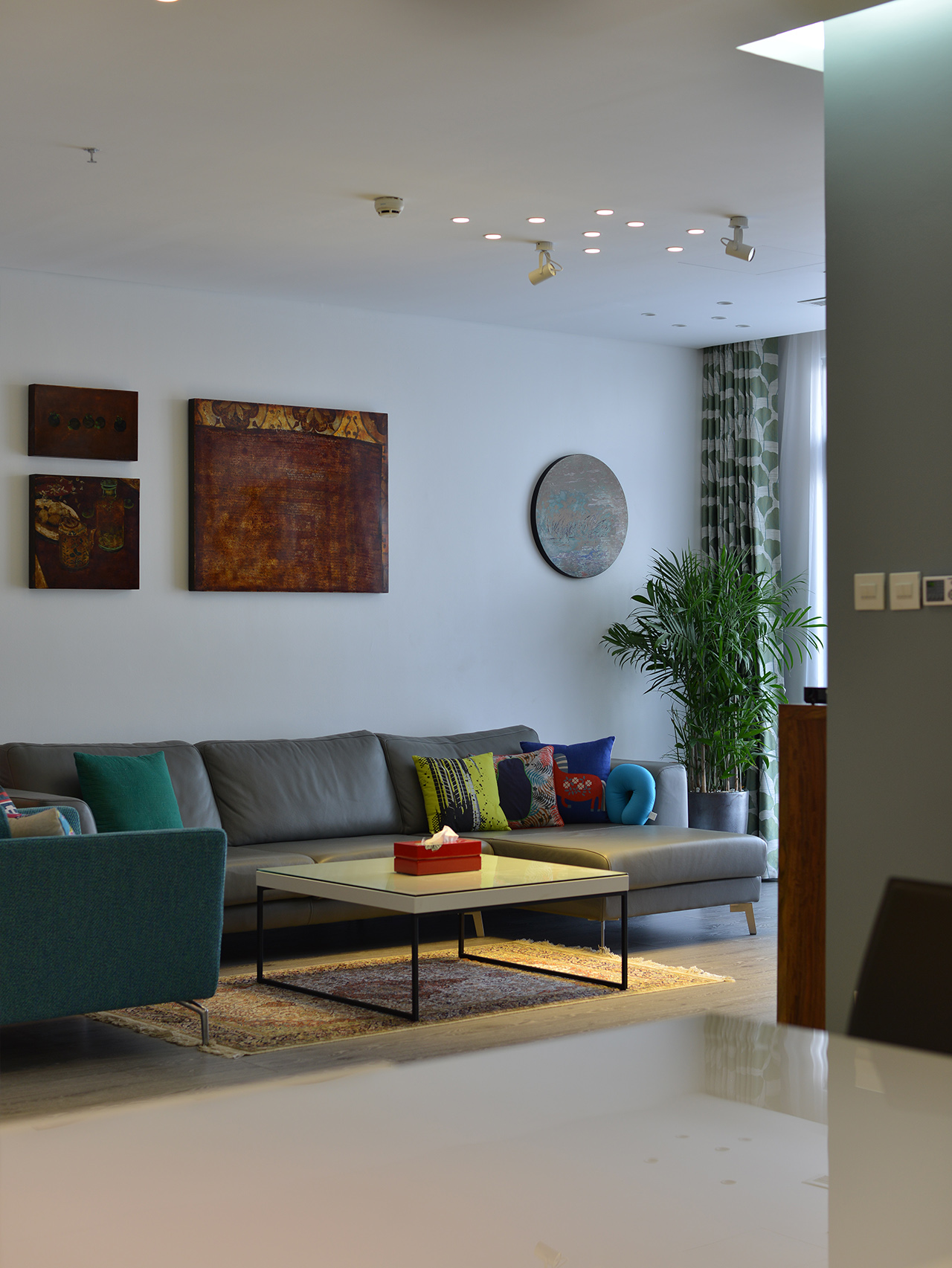 Đây là dự án cải tạo một căn hộ chung cư dành cho gia đình có ba thế hệ tại khu chung cư Royal City, Thanh Xuân, Hà Nội, cũng là dự án thứ 5 chúng tôi áp dụng nguyên lý “đồ nội thất kiến tạo không gian”. Không gian căn hộ trước khi cải tạo có một nhược điểm rất lớn trong điều kiện khí hậu của Việt Nam là có một phòng ngủ hoàn toàn không được chiếu sáng tự nhiên. Bên cạnh đó, các không gian sinh hoạt chung (bếp, ăn, khách) bị chia nhỏ, không liên thông mạch lạc với nhau tạo cảm giác chật chội. Câu hỏi đặt ra là làm thế nào để cải thiện các tiện nghi khí hậu trong các không gian sinh hoạt: chiếu sáng tự và thông gió tự nhiên cũng như mở rộng không gian sịnh hoạt tối đa cho căn hộ mà không can thiệp nhiều vào kết cấu xây dựng đã có từ trước? Giải pháp của chúng tôi là phá dỡ hệ tường xây ngăn chia phòng ngủ bên trong với phòng khách (thay thế bằng hệ tủ trang trí có ô thoáng), tường ngăn chia bếp với phòng ăn nhằm đưa ánh sáng tự nhiên vào sâu trong phòng ngủ, mở rộng không gian sinh hoạt chung, tạo sự thông thoáng. Hệ tủ tường và kệ trang trí kéo dài liên tục trên một phía tường từ tiền sảnh vào phòng khách, bằng công năng của nó, đã xác định nên tính chất các không gian mà nó đi qua, đồng thời là sự kết nối các không gian đó với nhau.